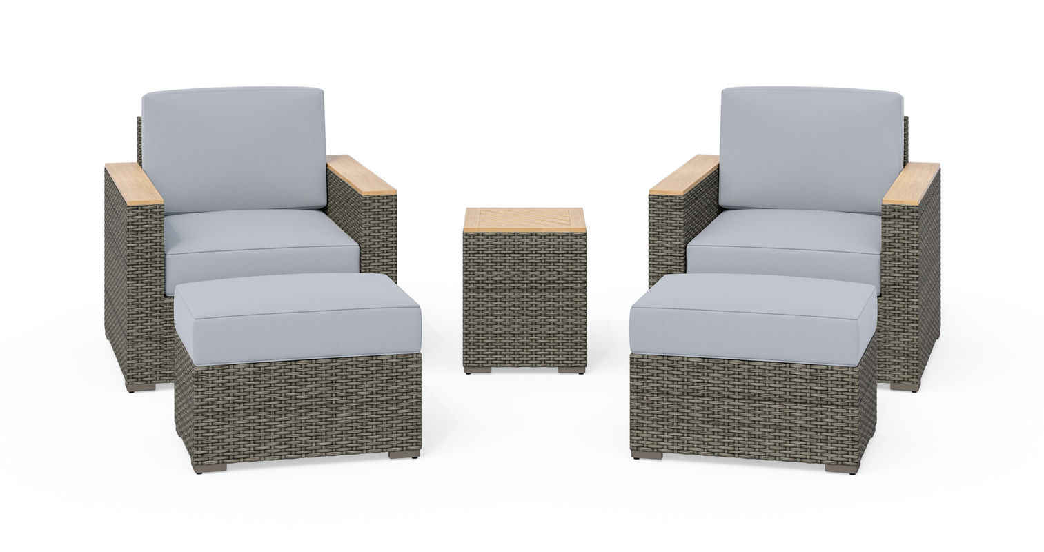 With its thick weave and elegant color, the Boca Raton collection captures the organic beauty of rattan. This set of two chairs, two ottomans, and a table brings an inviting architectural style to any indoor or outdoor setting. Enjoy lasting comfort with the plush seat and back cushions, which are fade-resistant and designed to withstand the elements. The rattan frames are entirely weather-resistant, and sit atop a sturdy steel frame. The Acacia table top is naturally resistant to water and fading, keeping it looking great season after season.
