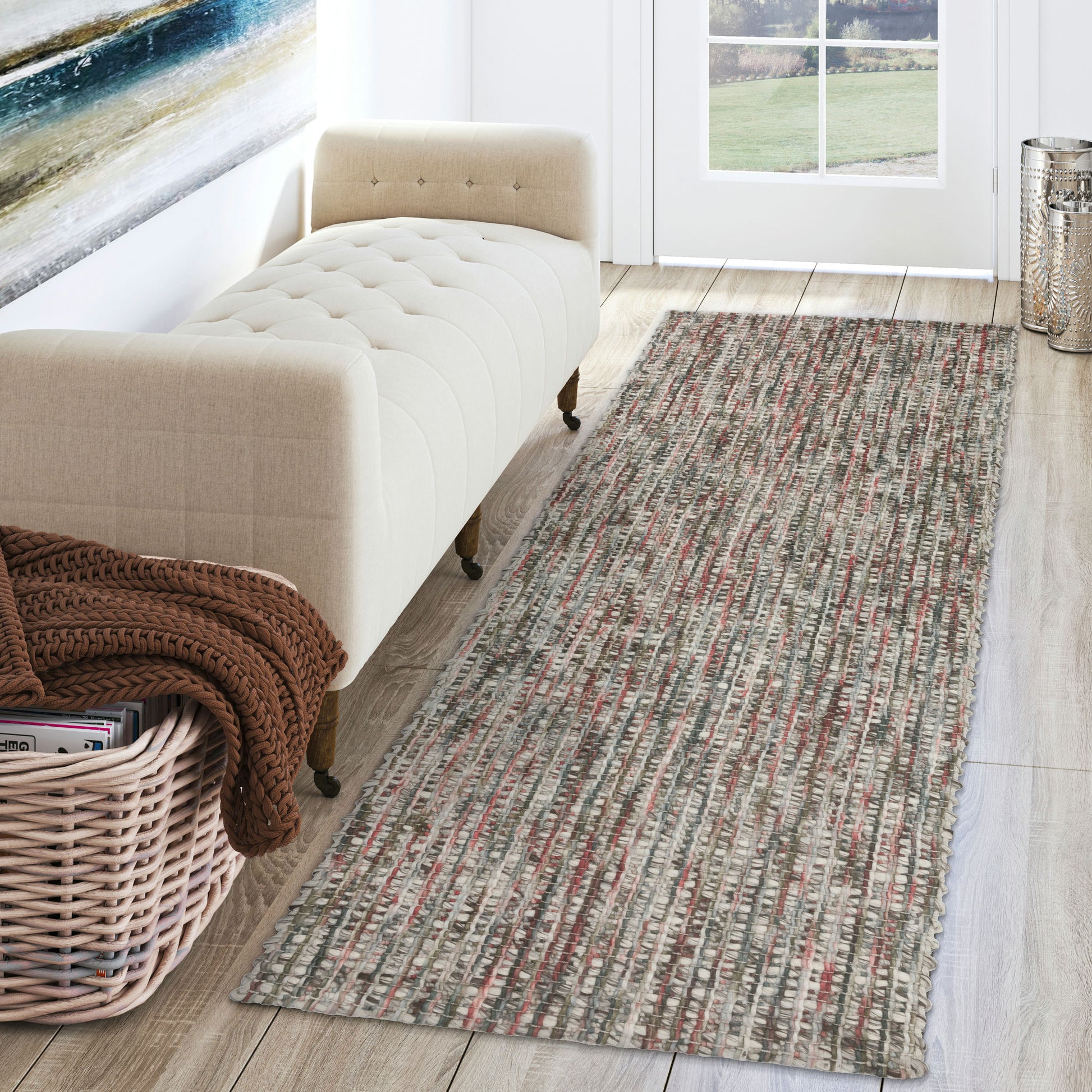 Bondi is a chunky "cobblestone" wool rug with undyed, tonal wool foundation with vertical, space dyed, accent yarns.