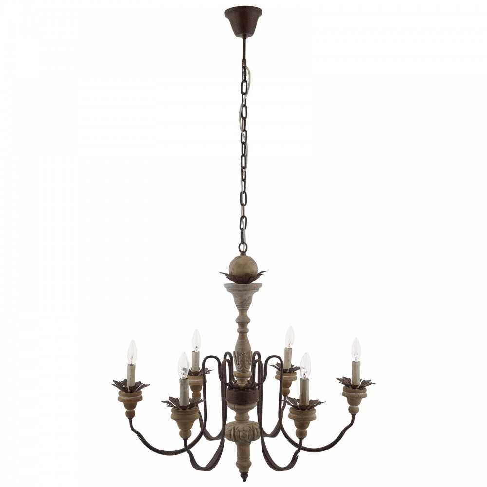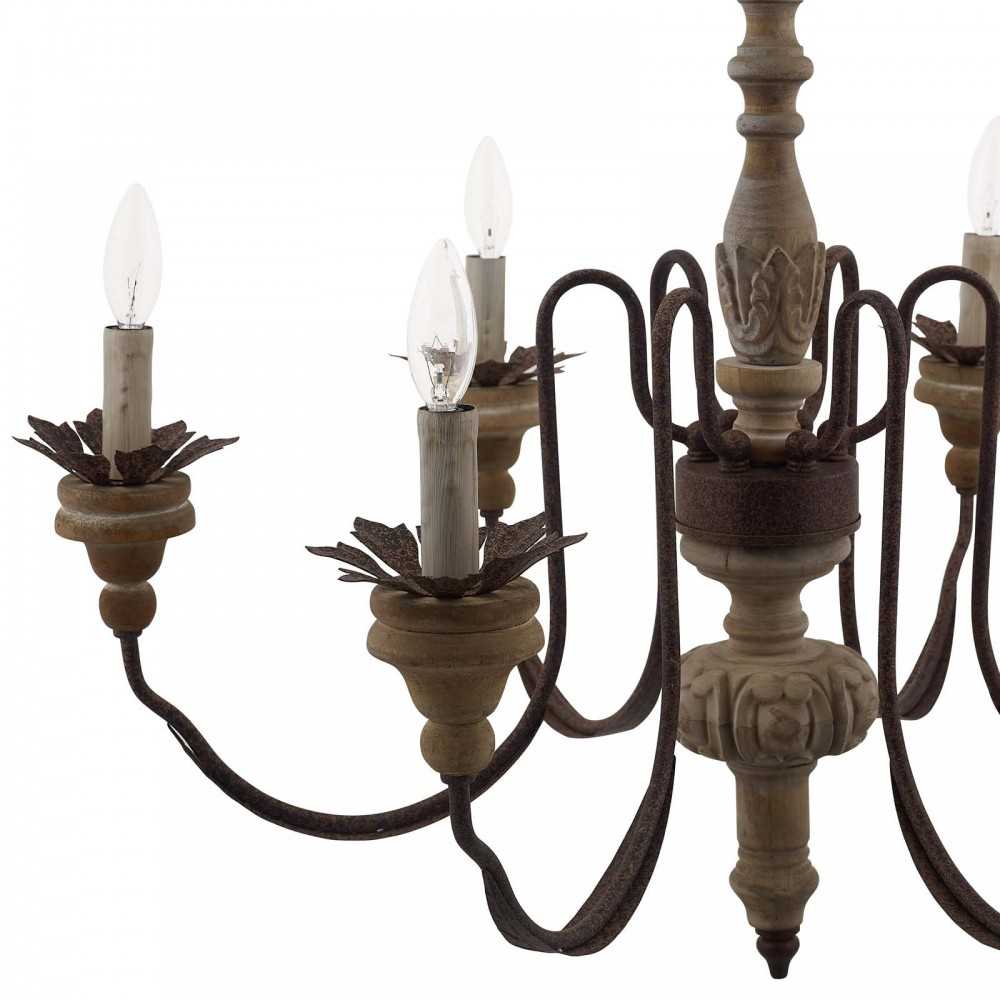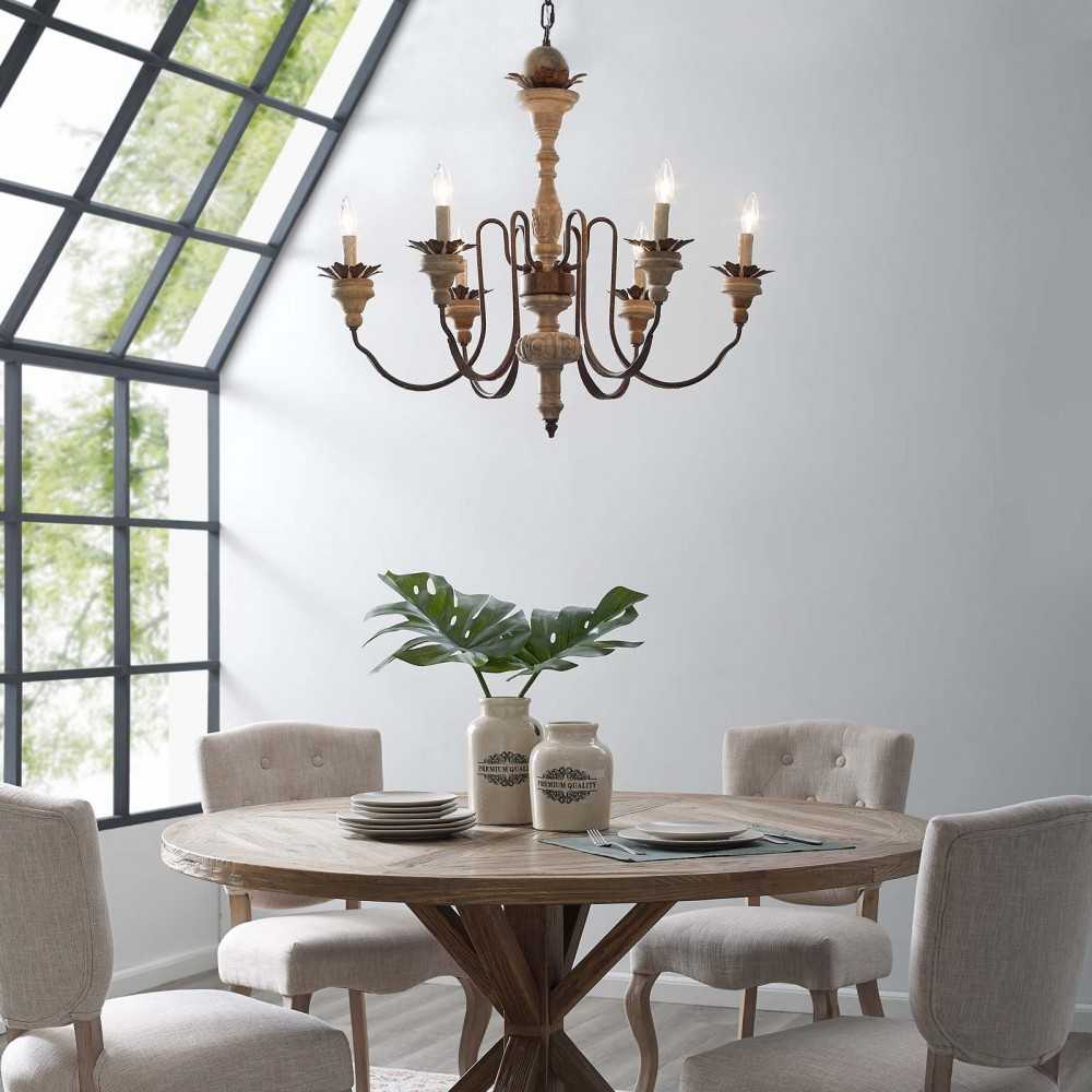 Elevate your home with the timeless elegance of the Bountiful Vintage French Pendant Ceiling Light Candelabra Chandelier. A vibrant addition to your living room, bedroom, foyer, or dining room, this modern farmhouse pendant light candelabra chandelier features sweeping metal arms, a beautifully carved natural wood center column, and candle-style light holders each surrounded by an ornate leaf design. Bountiful hangs from a 49" metal chain with a flush wall mount and grants chateau charm to your home. This rustic pendant light fixture requires six E12 25-watt light bulbs (not included).