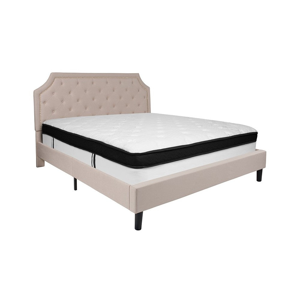 Brighton King Size Tufted Upholstered Platform Bed in Beige Fabric with Memory Foam Mattress