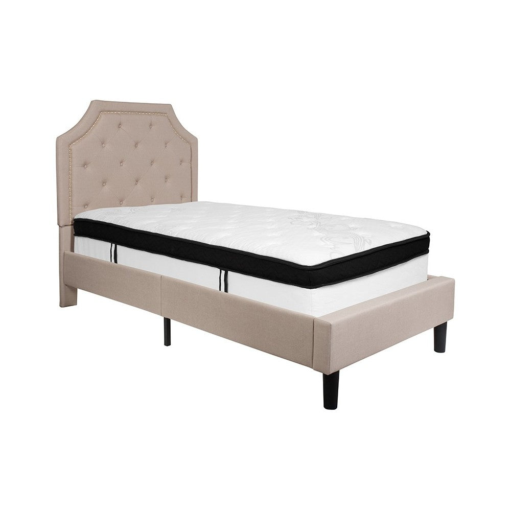 Brighton Twin Size Tufted Upholstered Platform Bed in Beige Fabric with Memory Foam Mattress