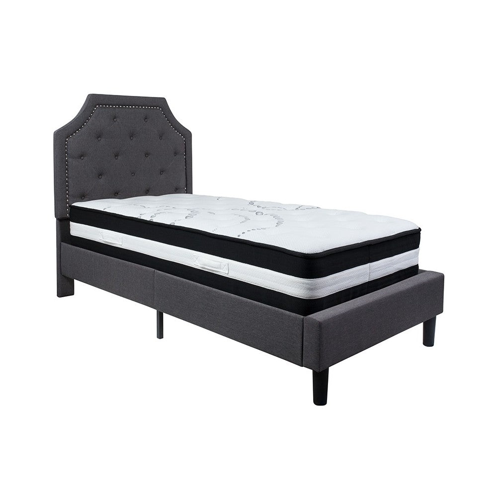 Brighton Twin Size Tufted Upholstered Platform Bed in Dark Gray Fabric with Pocket Spring Mattress