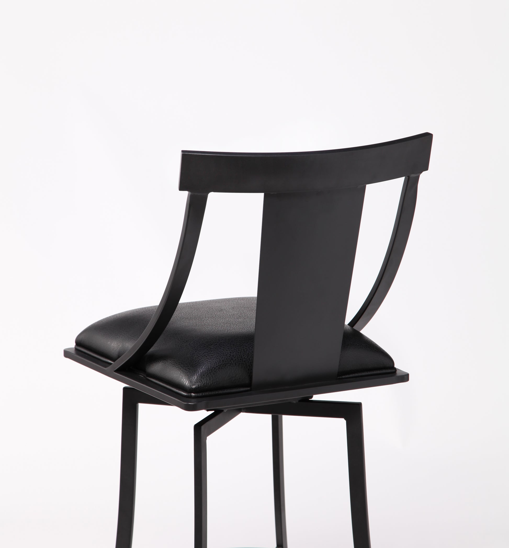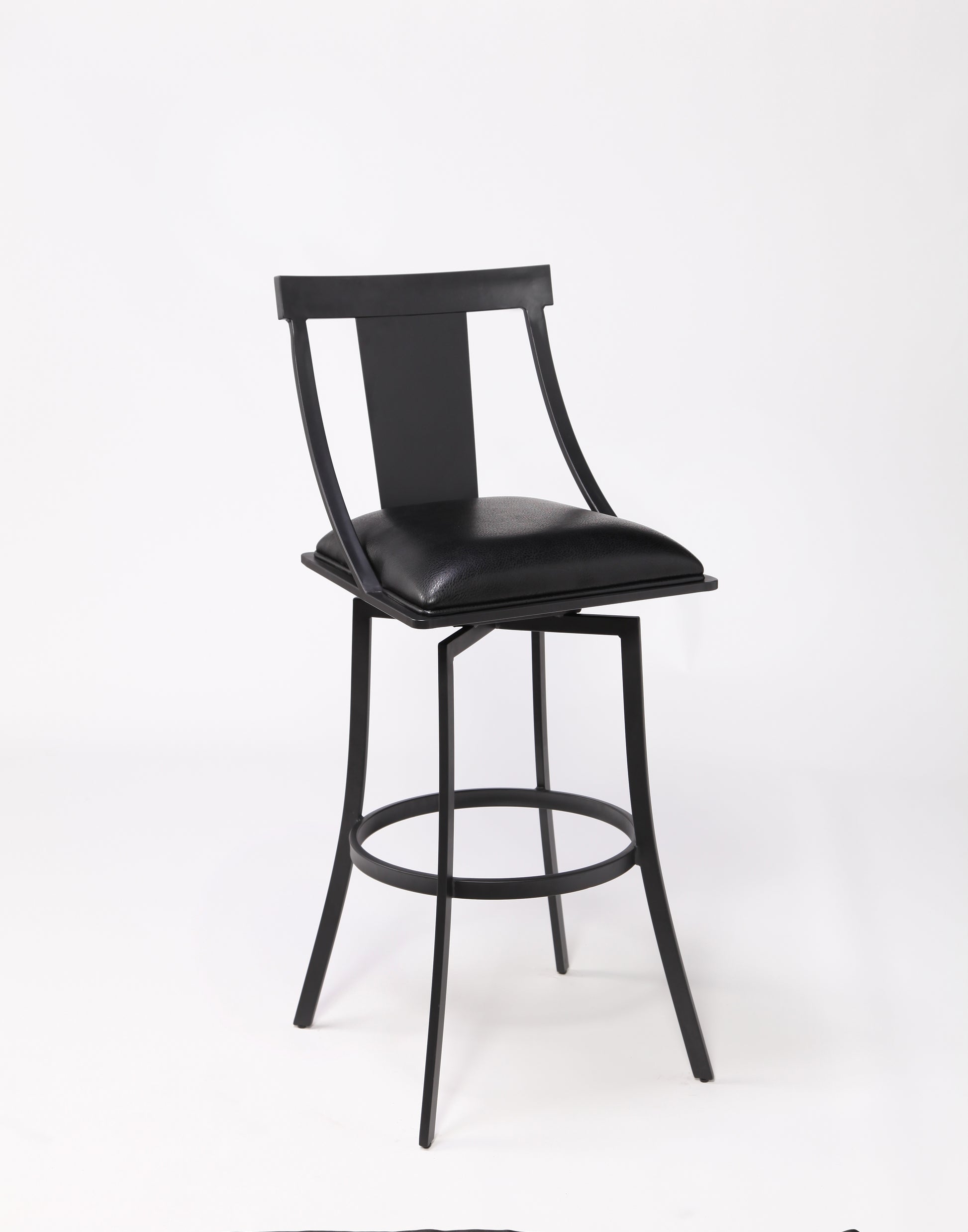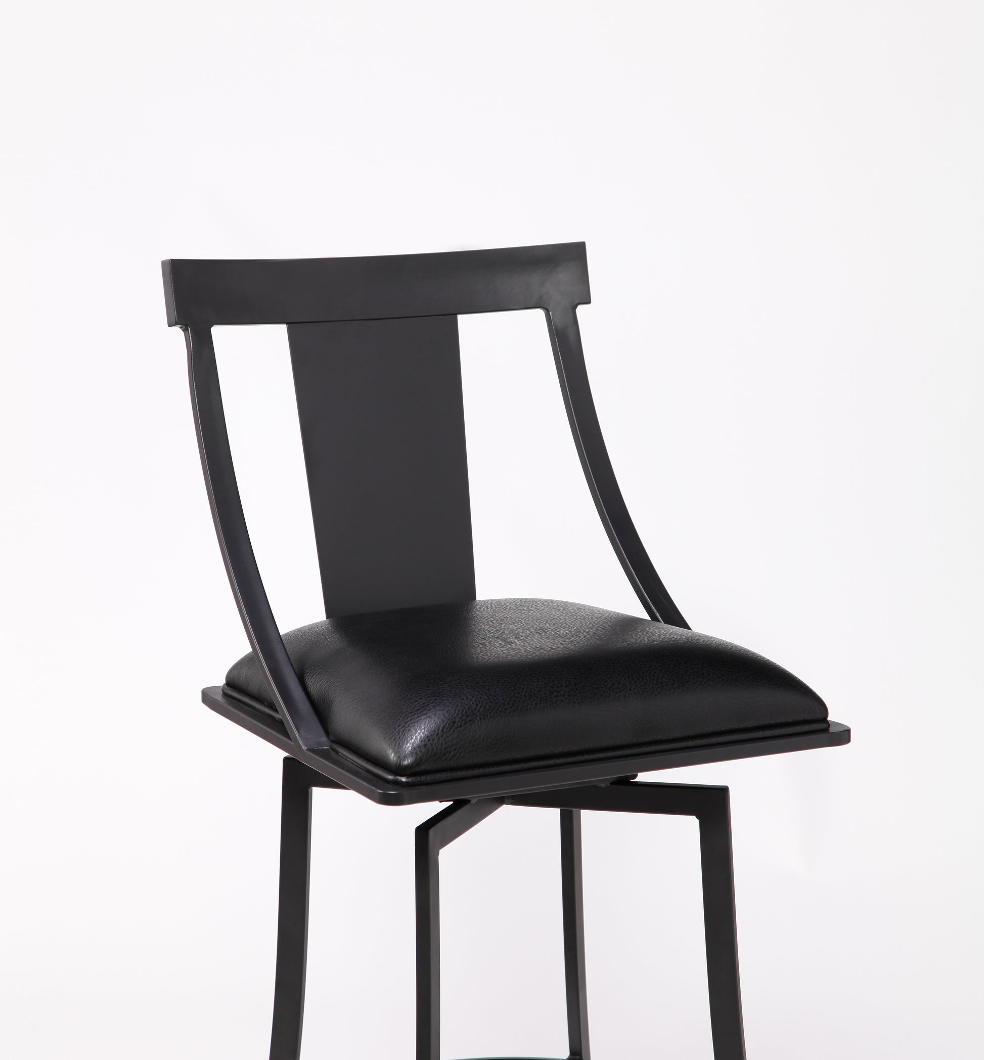 The Armen Living Brisbane contemporary barstool combines the durability of quality metal construction with modern aesthetics to bring you a truly attractive home furnishing piece. The Brisbane's beautifully curved tall back and legs are made of dependable steel while the seat is reinforced by wood and topped by a plump seat cushion. The Brisbane's exceptionally comfortable seat features a 360 degree swivel mechanism, allowing for a wide range of movement while seated. The stool's curved legs come complete with a convenient round footrest for added support. The tips of the Brisbane's legs feature rubber nibs, preventing the barstool from slipping on or scratching hardwood or tile surfaces. An excellent choice for the home bar or kitchen, the Brisbane is sold in three unique styles: A beautiful Matte Black finished variant with a Vintage Gray faux leather seat cushion, A Matte Black finished variant with a Ford Black faux leather cushion, and an Auburn Bay finished variant with a Ford Brown faux leather upholstered seat cushion. Each style is sold in two industry standard sizes; 26 inch counter and 30 inch bar height.