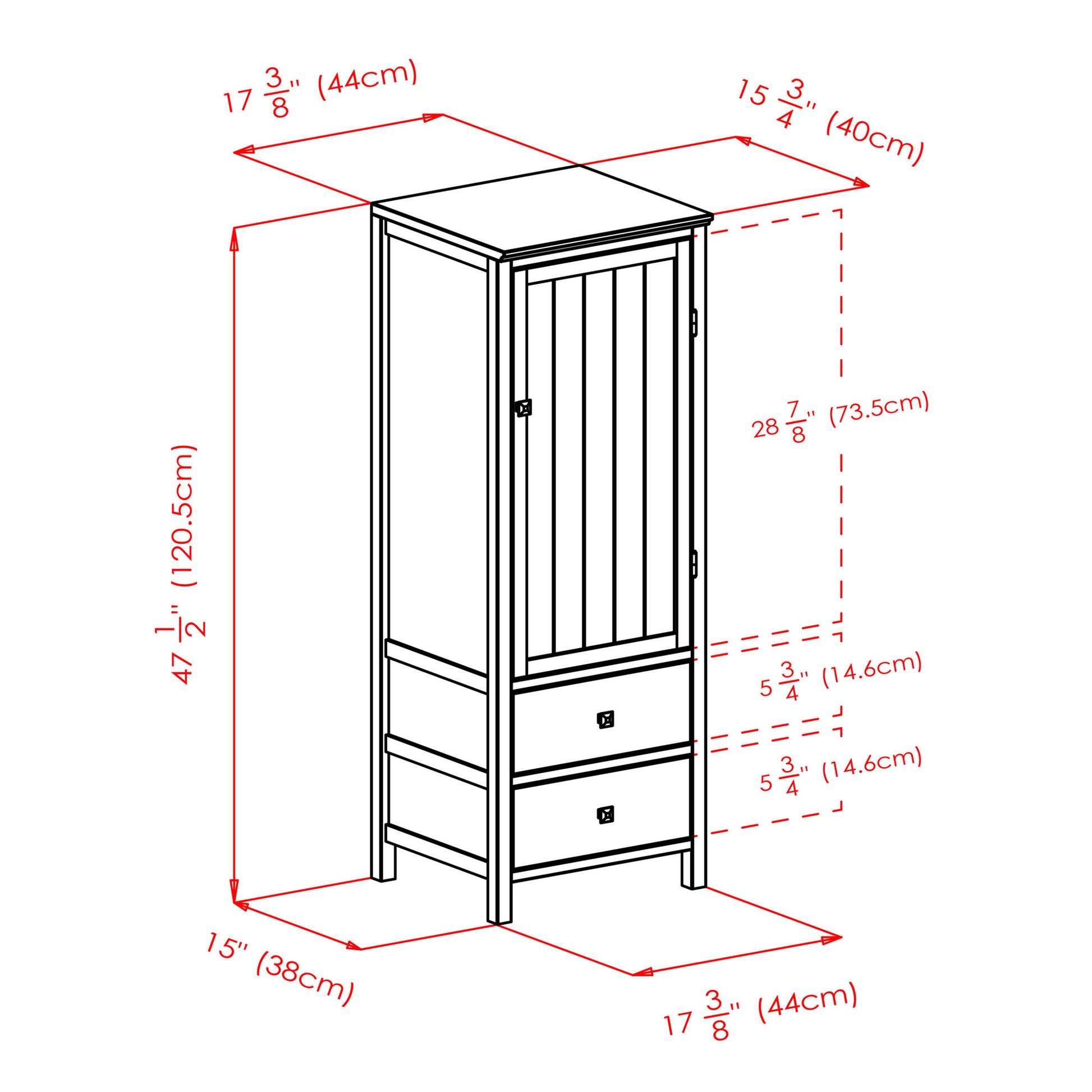 Bring a French Country look and modern convenience to your storage in the Brooke Jelly Cupboard. The wainscoting panel in the cabinet door will add charm to the kitchen, dining area, or anywhere you need handsome storage. The cupboard has a three-quarter cabinet with interior shelf and two lower drawers. Both the cabinet and drawer pulls have a brushed silver finish. Overall dimensions of the cupboard are 17.3" x 15.75"D x 47.4"H. Constructed of solid and composite wood in Walnut finish.