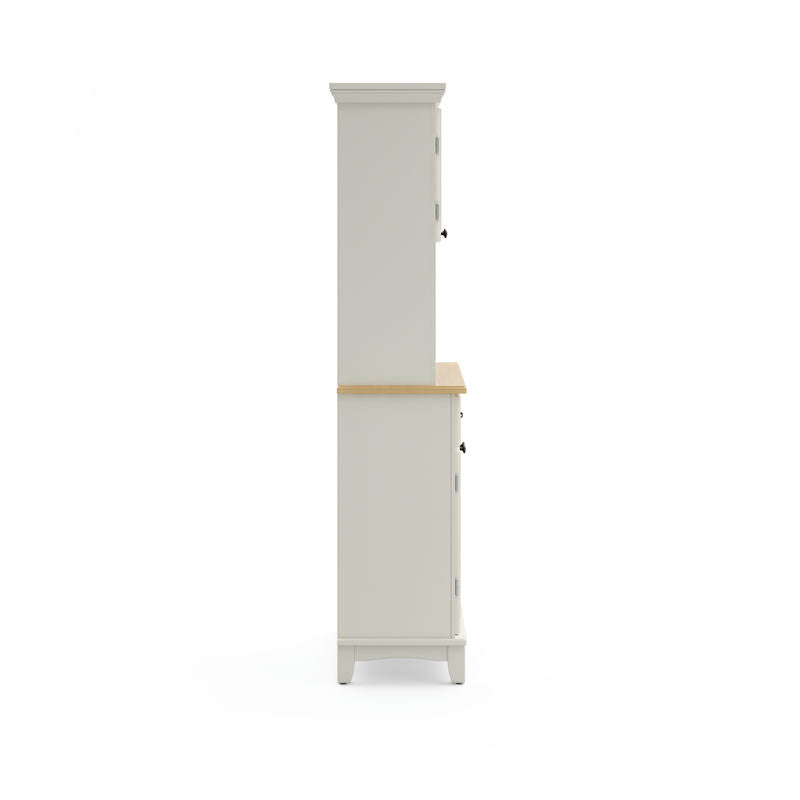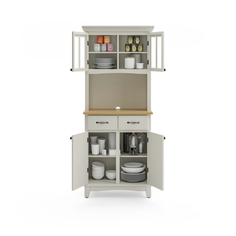 Store it all, display it all, and have it all with the Homestyles Buffet of Buffets Server with Hutch. Whether used in the kitchen, dining room, or anywhere else, it brings organization to your life and style to your home. The variety of storage options from cabinet shelves to drawers gives you the flexibility to figure out what's just right for you. Glass cabinet doors on the top put your most special items on display, while the hardwood top is a convenient place for commonly used items. Pack more storage into a smaller footprint with this off-white server that easily coordinates with a variety of environments.