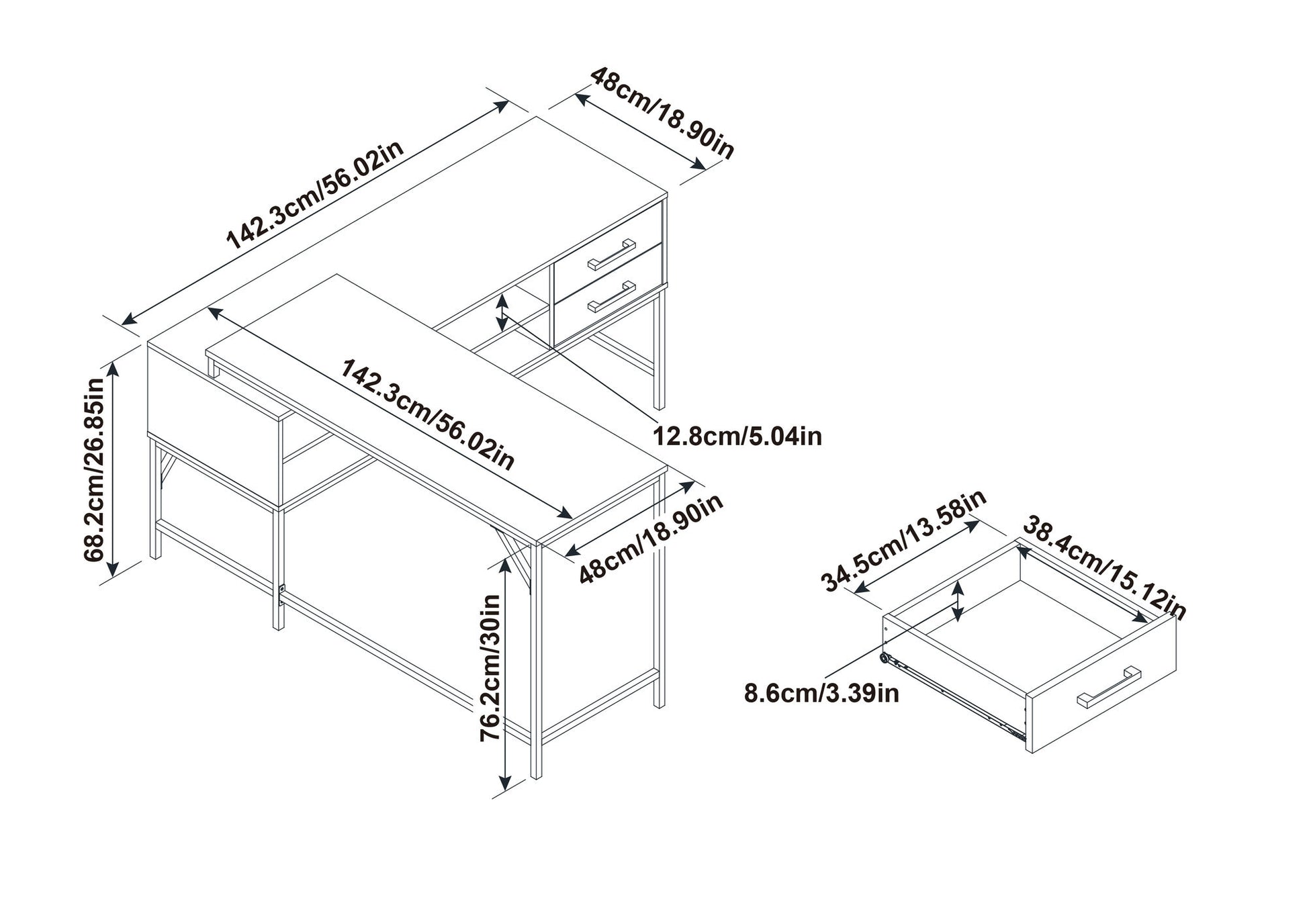 This large L shape executive style desk is the perfect addition to any home office. Large desktop provides ample space for work and the lower drawers and cubicals provide lots of storage. Powder coated metal legs laminate wood top give this unit a upscale look.