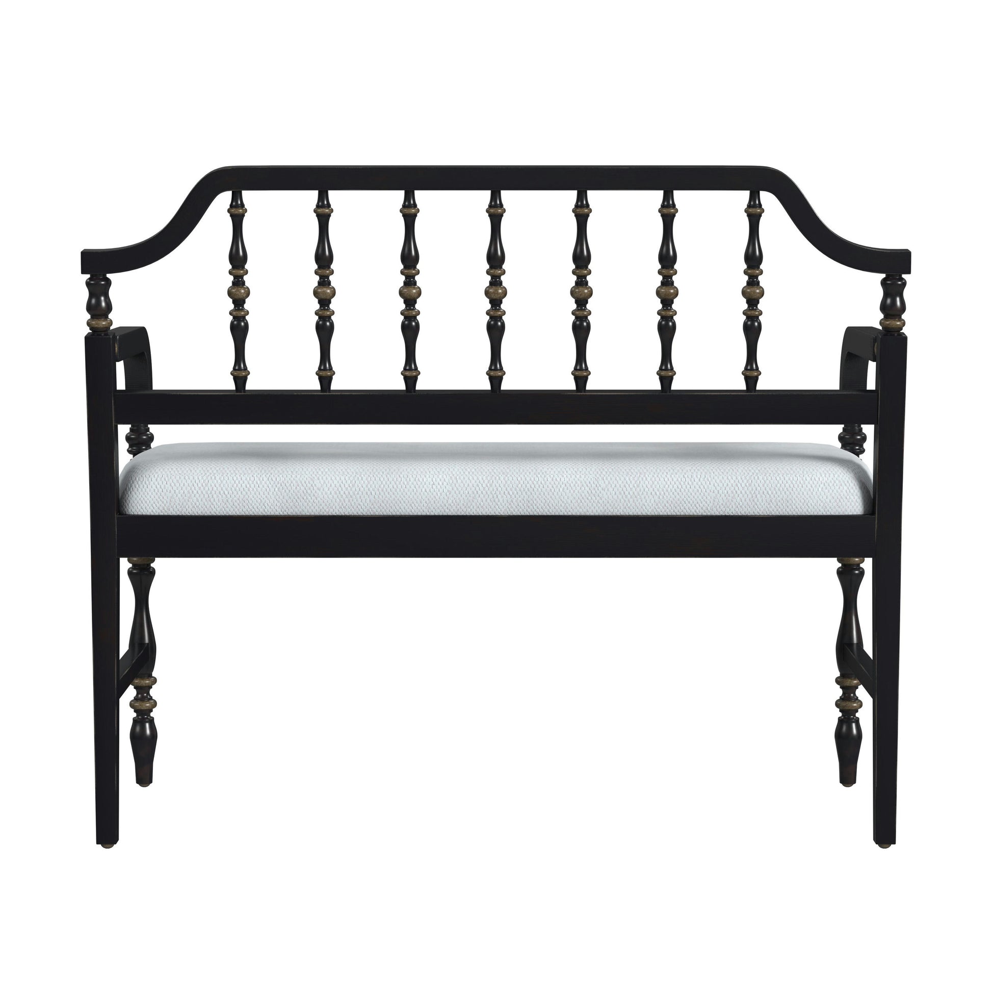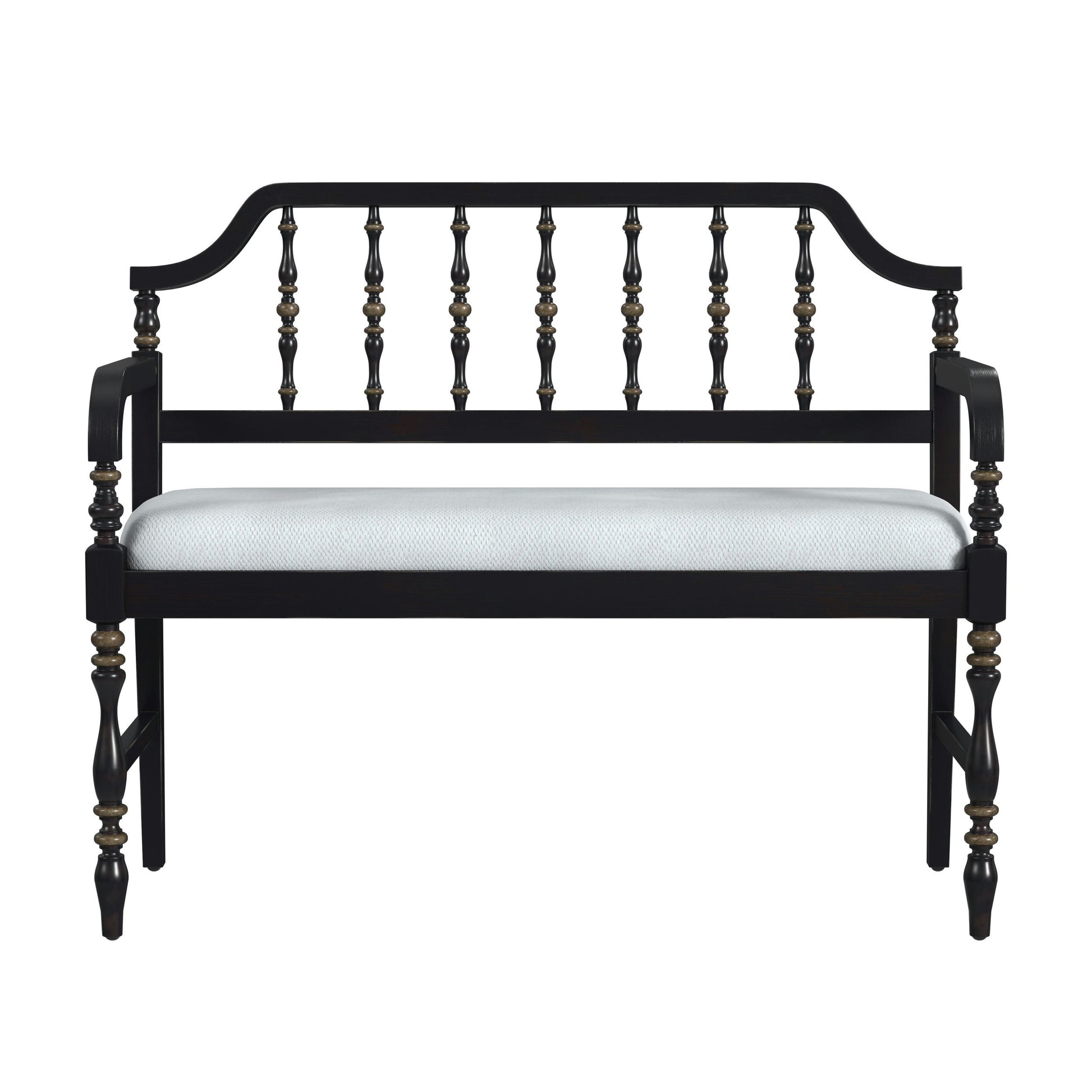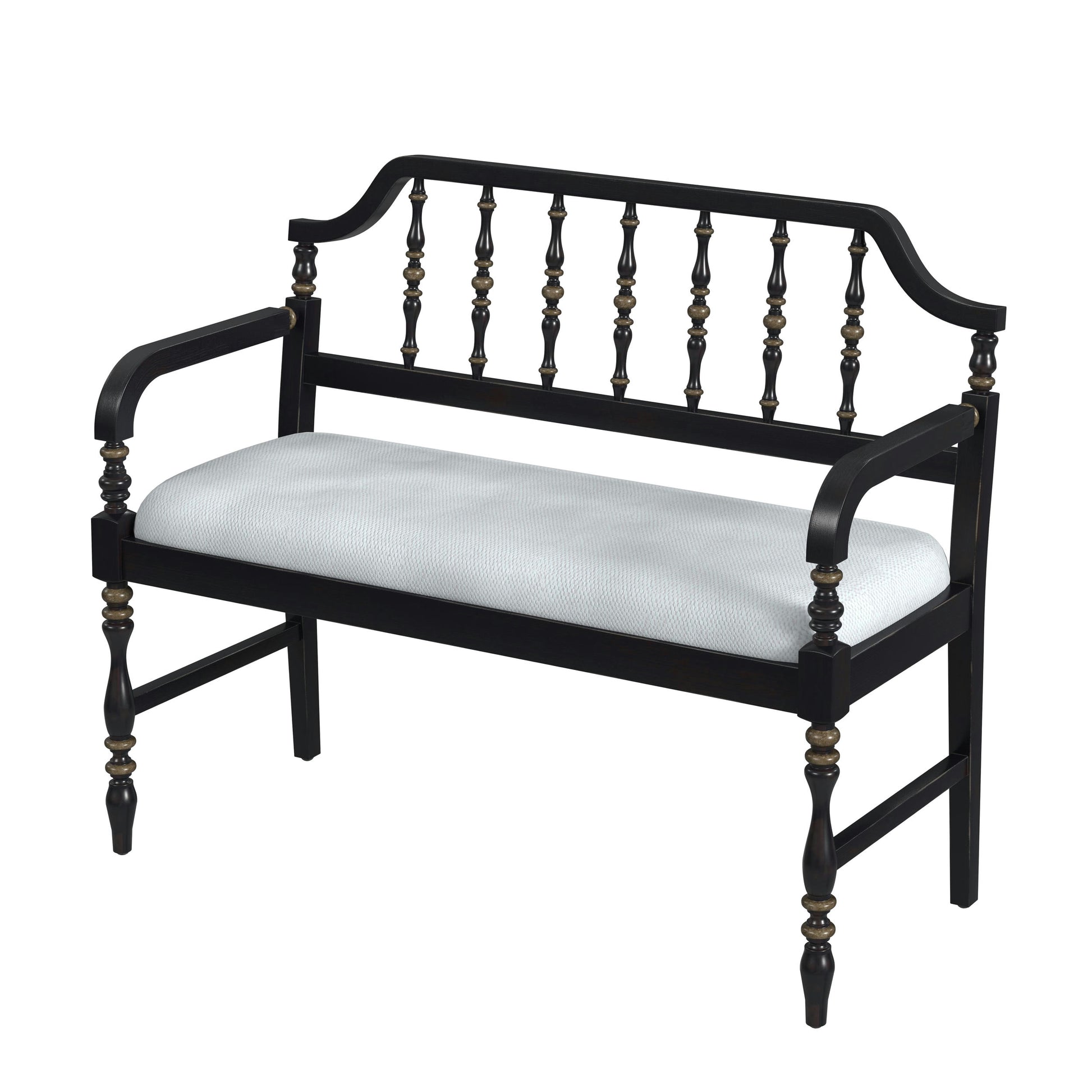Let guests kick off their shoes in the entryway with this delightful hand painted, spindled back, bench. Featuring a weathered black finish, crafted with Rubberwood, Plywood, a comfortable foam and cotton seat, this is an effortless update to your seating ensemble in the living room.