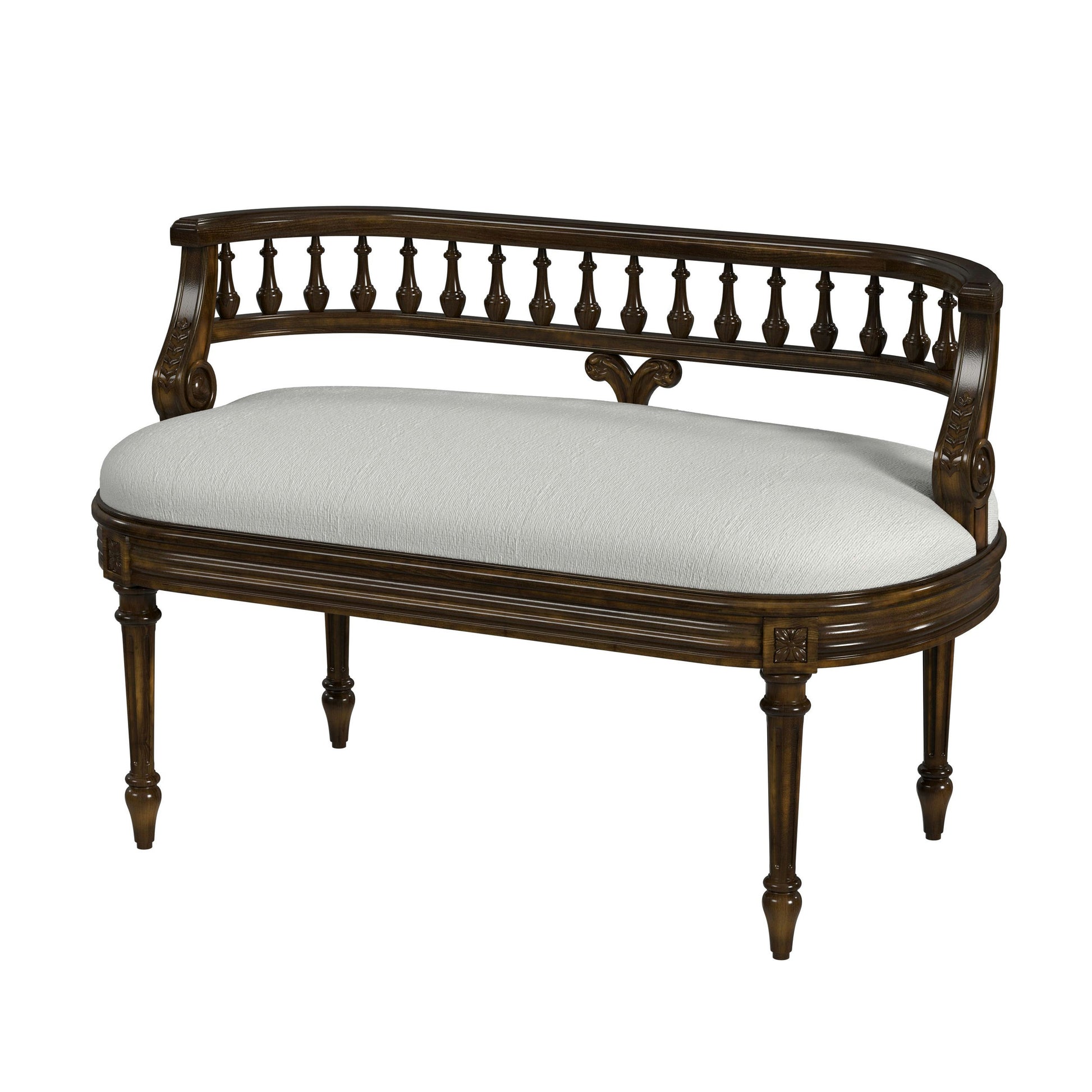 The Beautiful Hathaway 37" bench in antique cherry finish will infuse elegance into virtually any decor. Handcrafted from rubberwood solids and wood products, it features a carved spindle back, fluted legs and ballerina feet. The generously sized cream colored seat cushion is upholstered in an cotton hobnail fabric and features floral appliques on the seat apron and leaf applique on seat back arms.