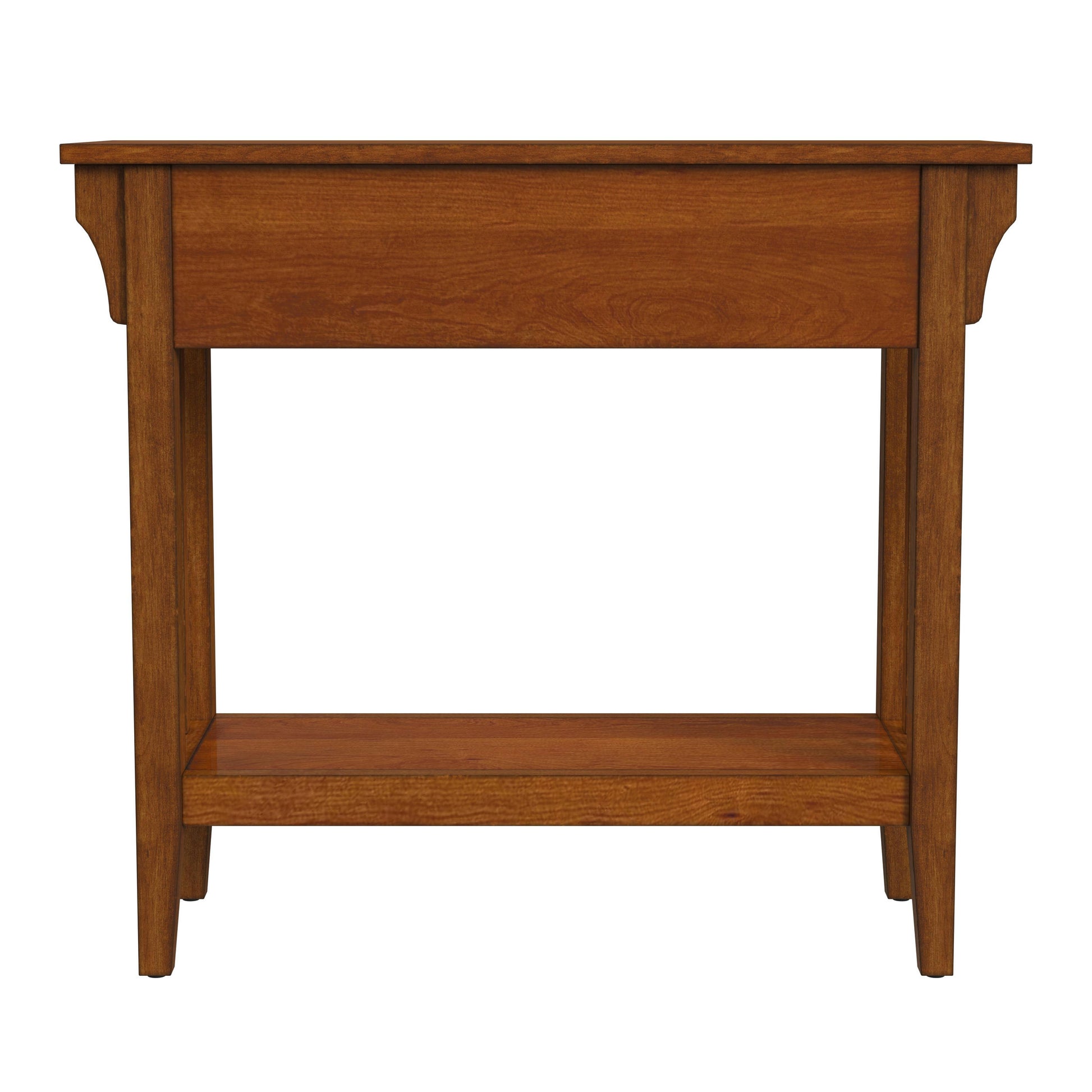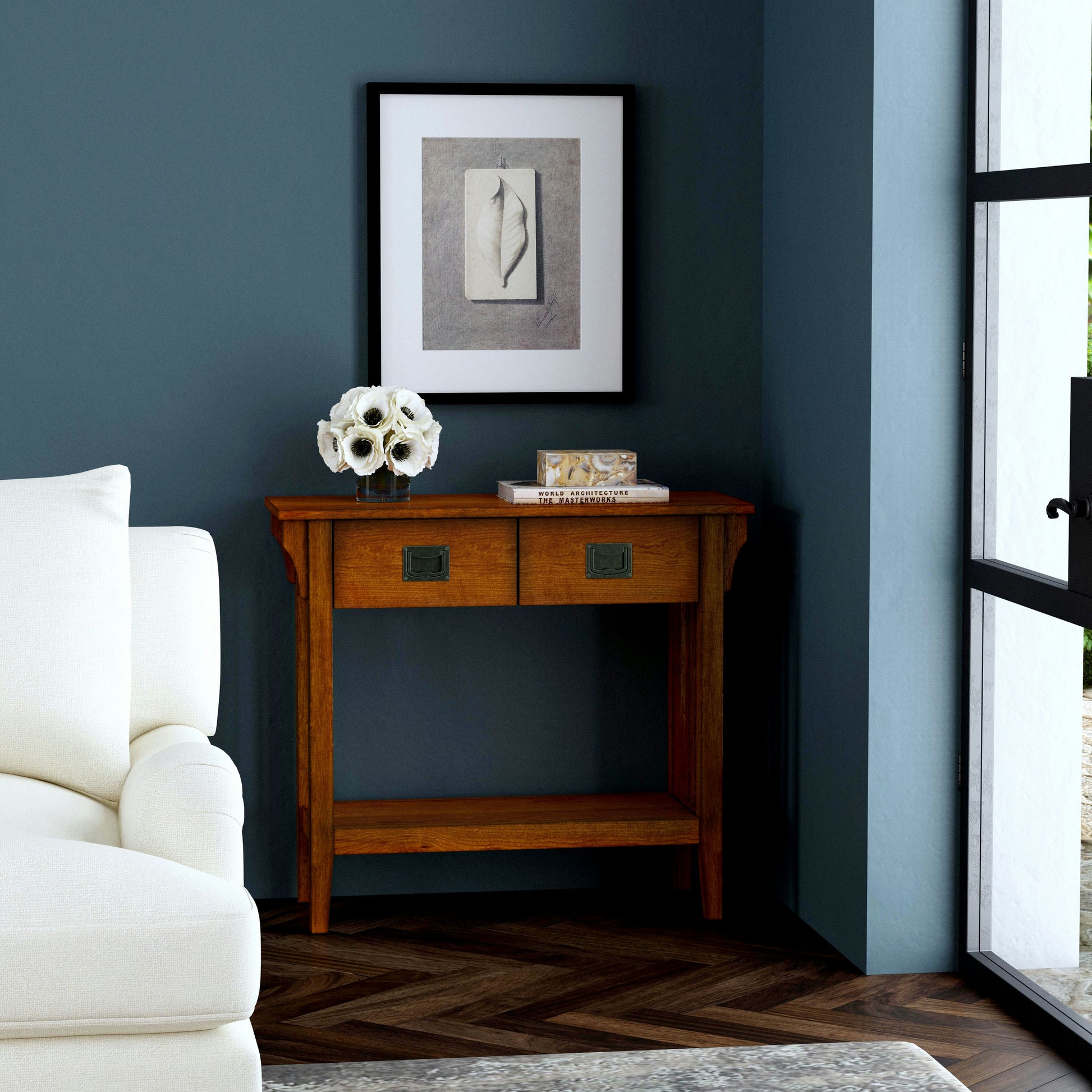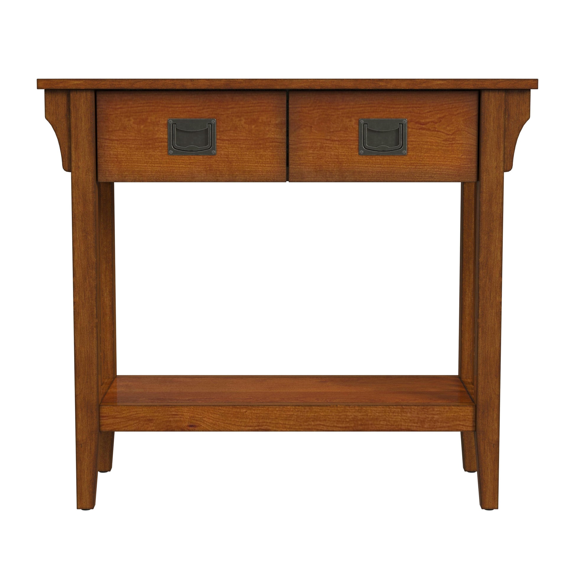 This charming Mission-inspired console table is a beautiful addition to an entryway, in the kitchen, behind a sofa or loveseat, or at the foot of a bed. Expertly crafted from rubberwood solids, manufactured wood products, and birch veneer, it is adorned in a rich olive ash burl finish on all sides with slatted side panels. In addition to its good looks, the table features a towel bar on both sides, a display shelf down below, and two storage drawers with recessed antique bronze finished hardware.