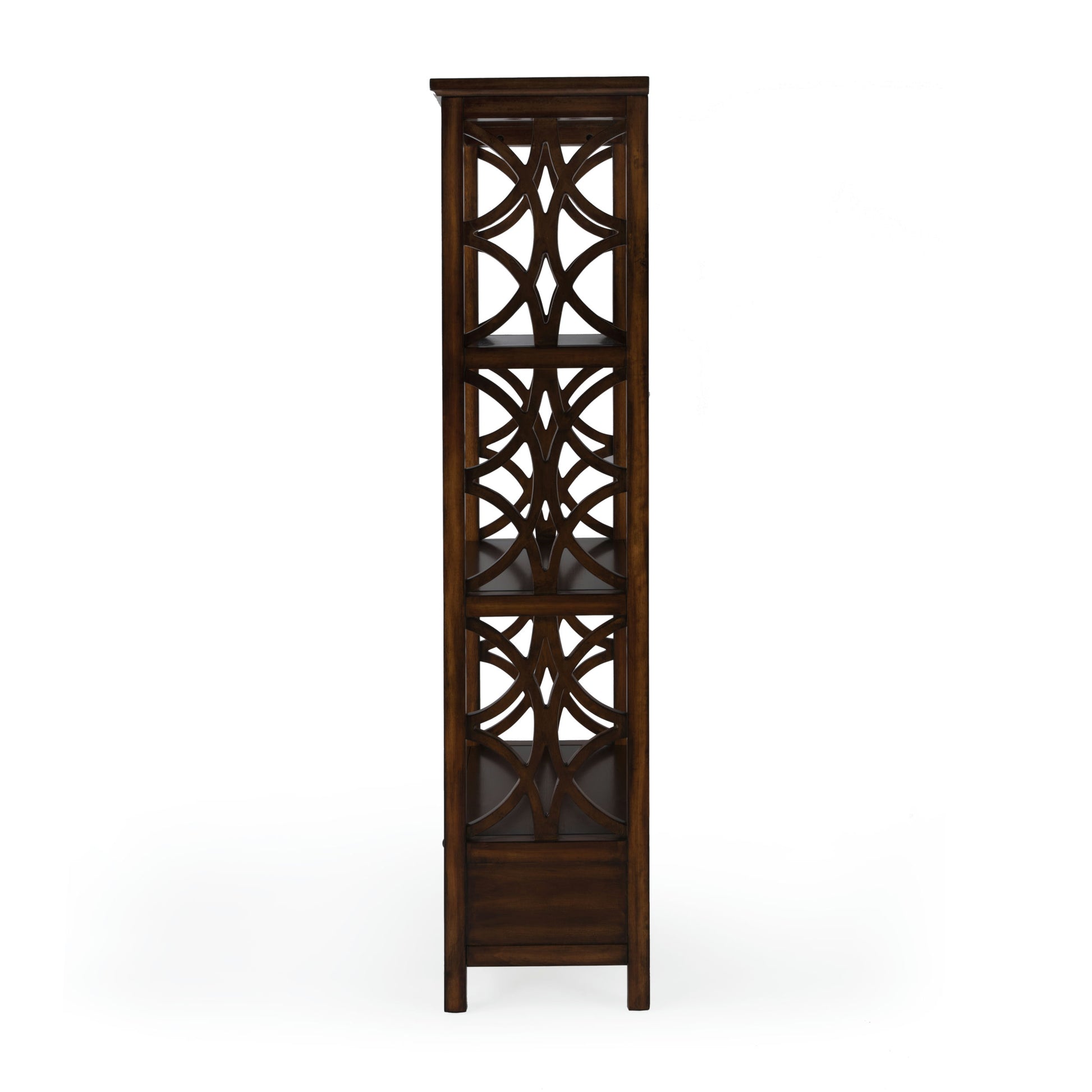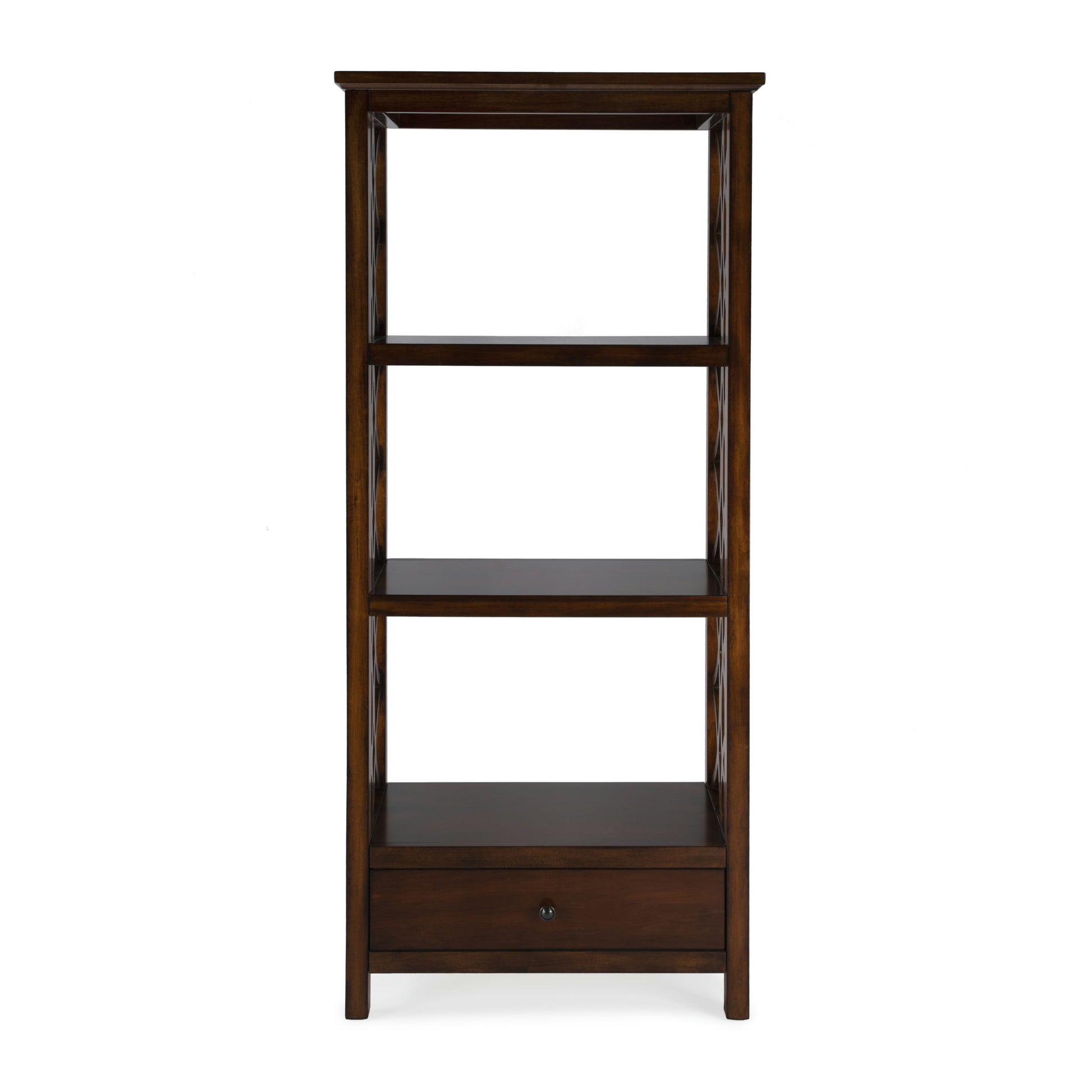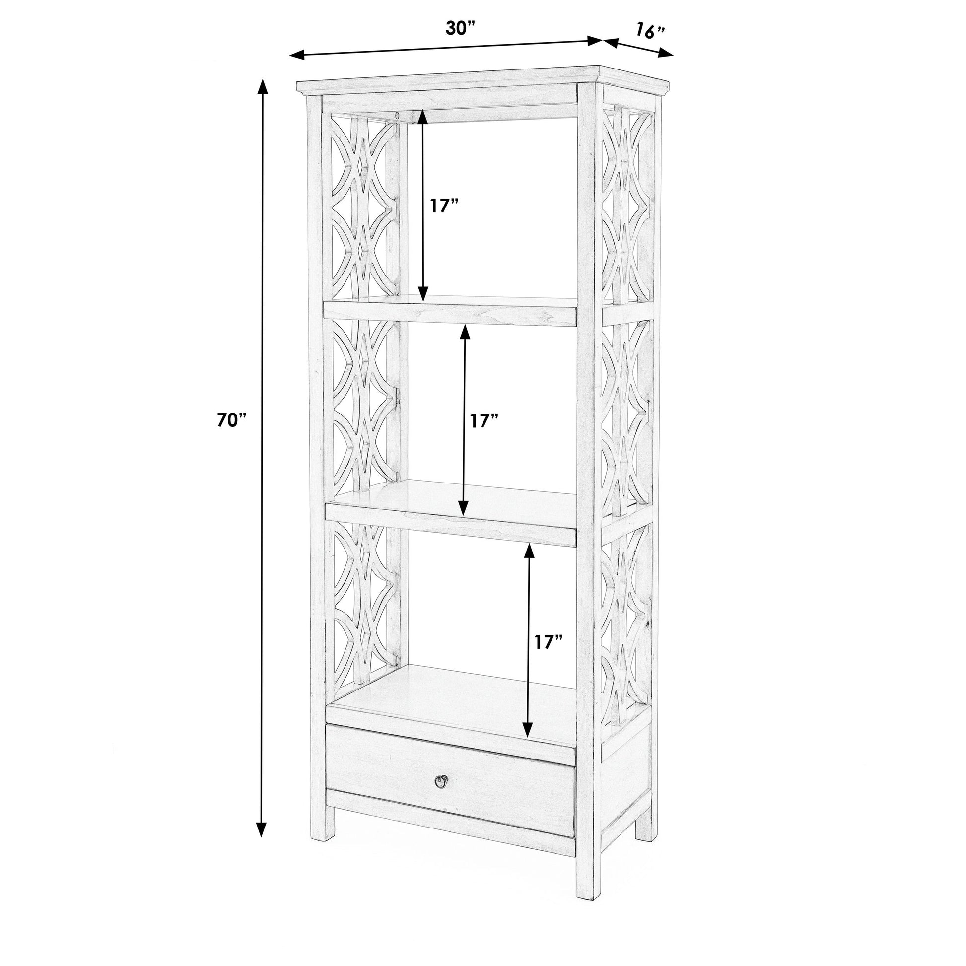 The Lorena 30"W 3-Tier Etagere offers the perfect combination of open and hidden storage for an elegant fixture in your living space or office. Crafted from solid wood and veneers and featuring gorgeous latticework side panels and a pullout drawer on the bottom, this piece brings an airy form and traditional style that's built to last.
