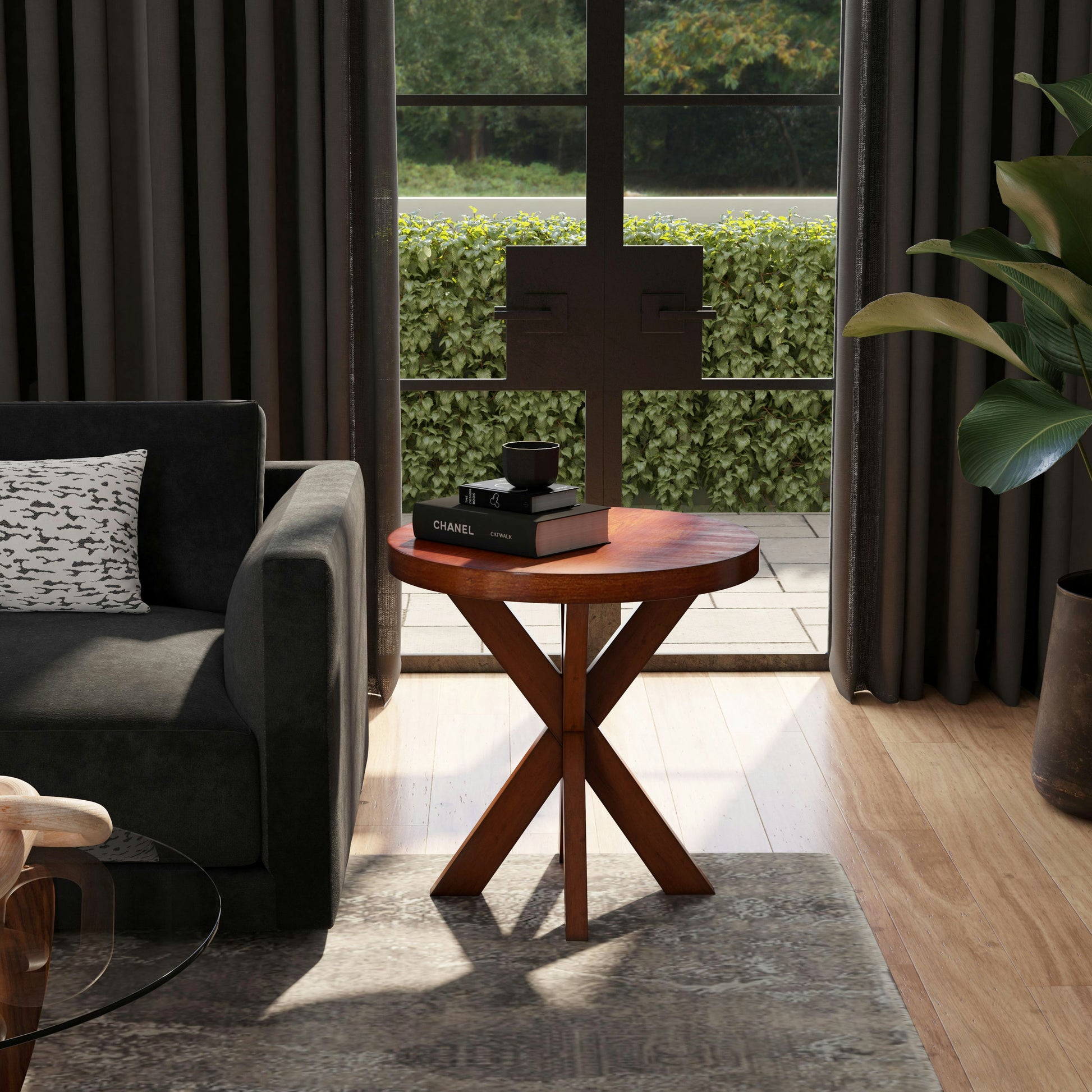 This contemporary accent table is uniquely appointed with a solid hardwood four-legged double "X" base. It is hand crafted from select hardwood solids and wood products, it features a veneers on the top and along the apron in a beautiful antique cherry finish.