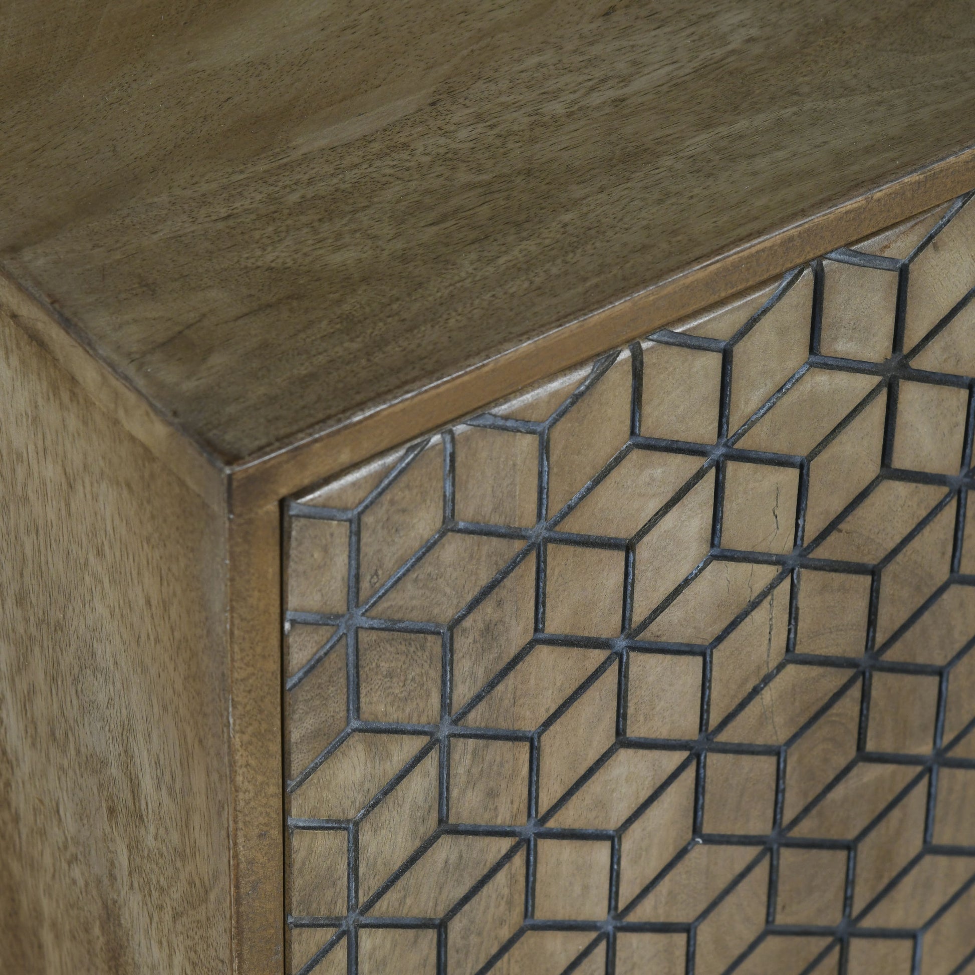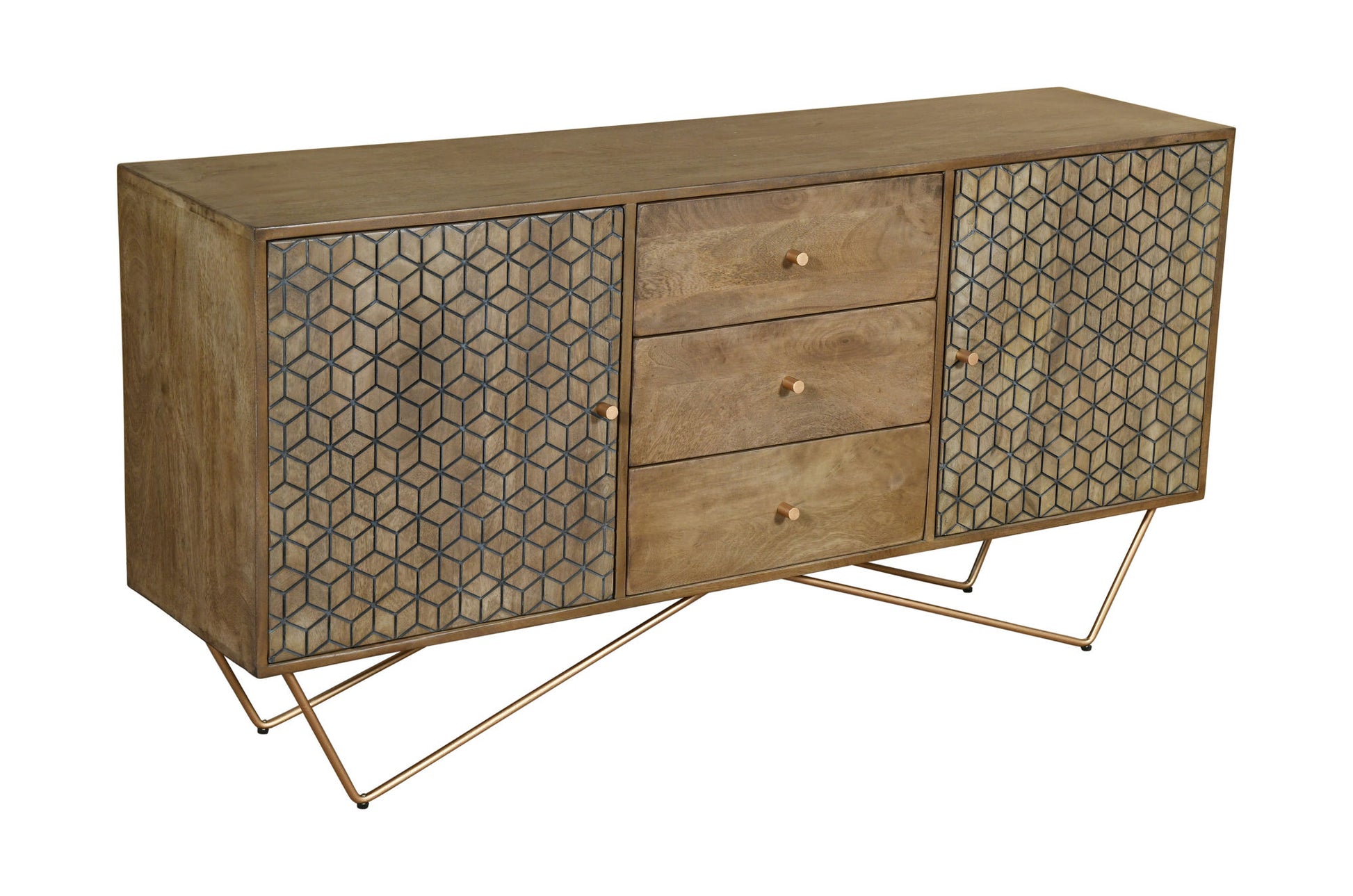 Style and function come together with this artfully designed solid wood sideboard. Crafted from mango wood, this sideboard features two doors boasting an intricately carved modern geometric pattern and three drawers that offer plenty of storage for all your linens, dishes and more. Gold triangular metal legs and gold handles complete the look making this a great piece for your dining room, living room or entryway