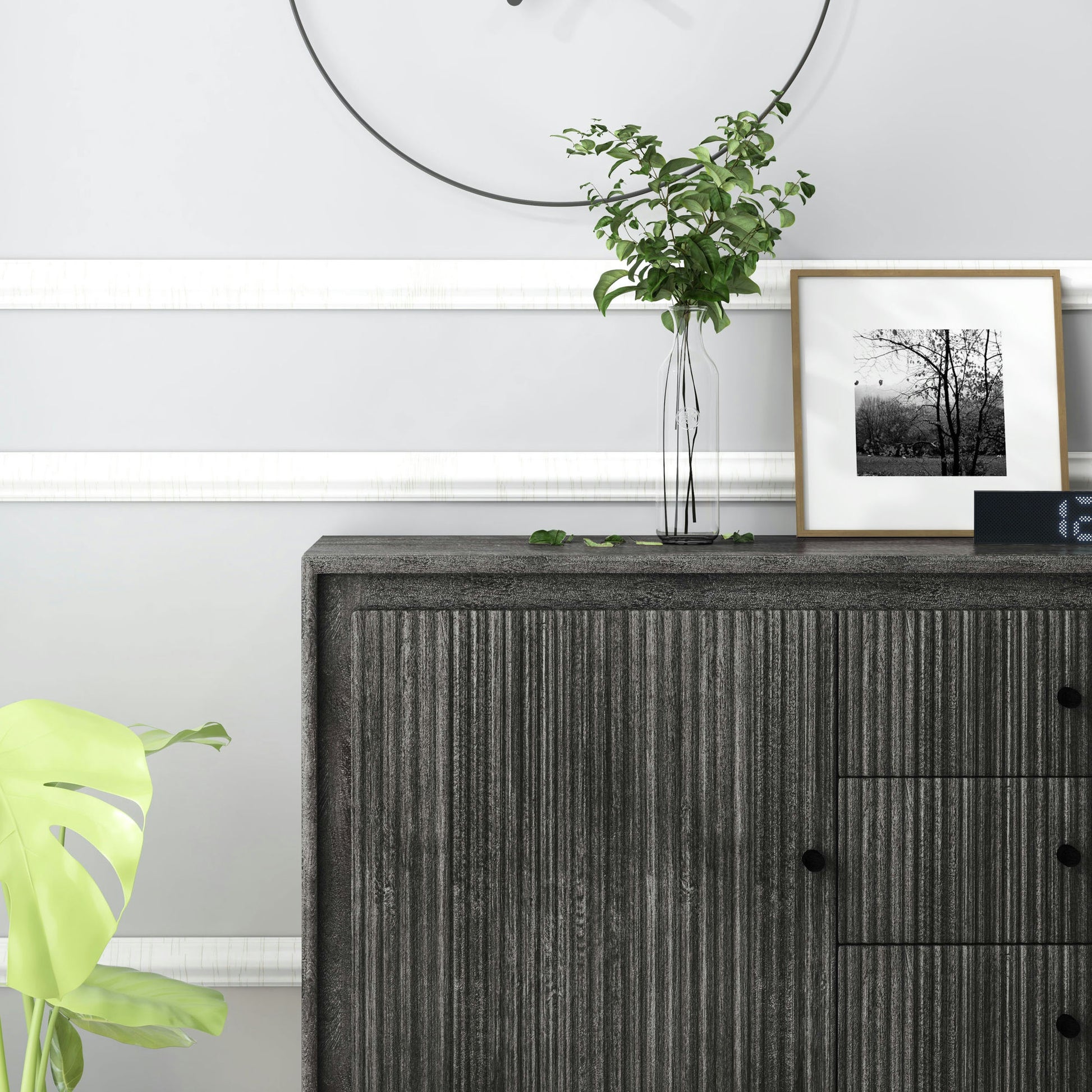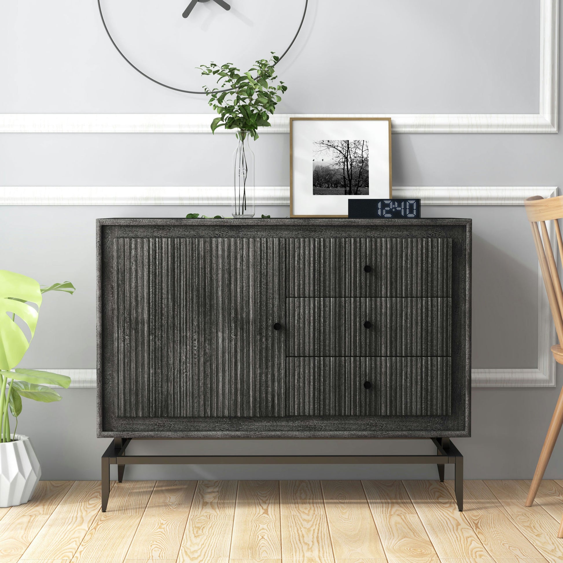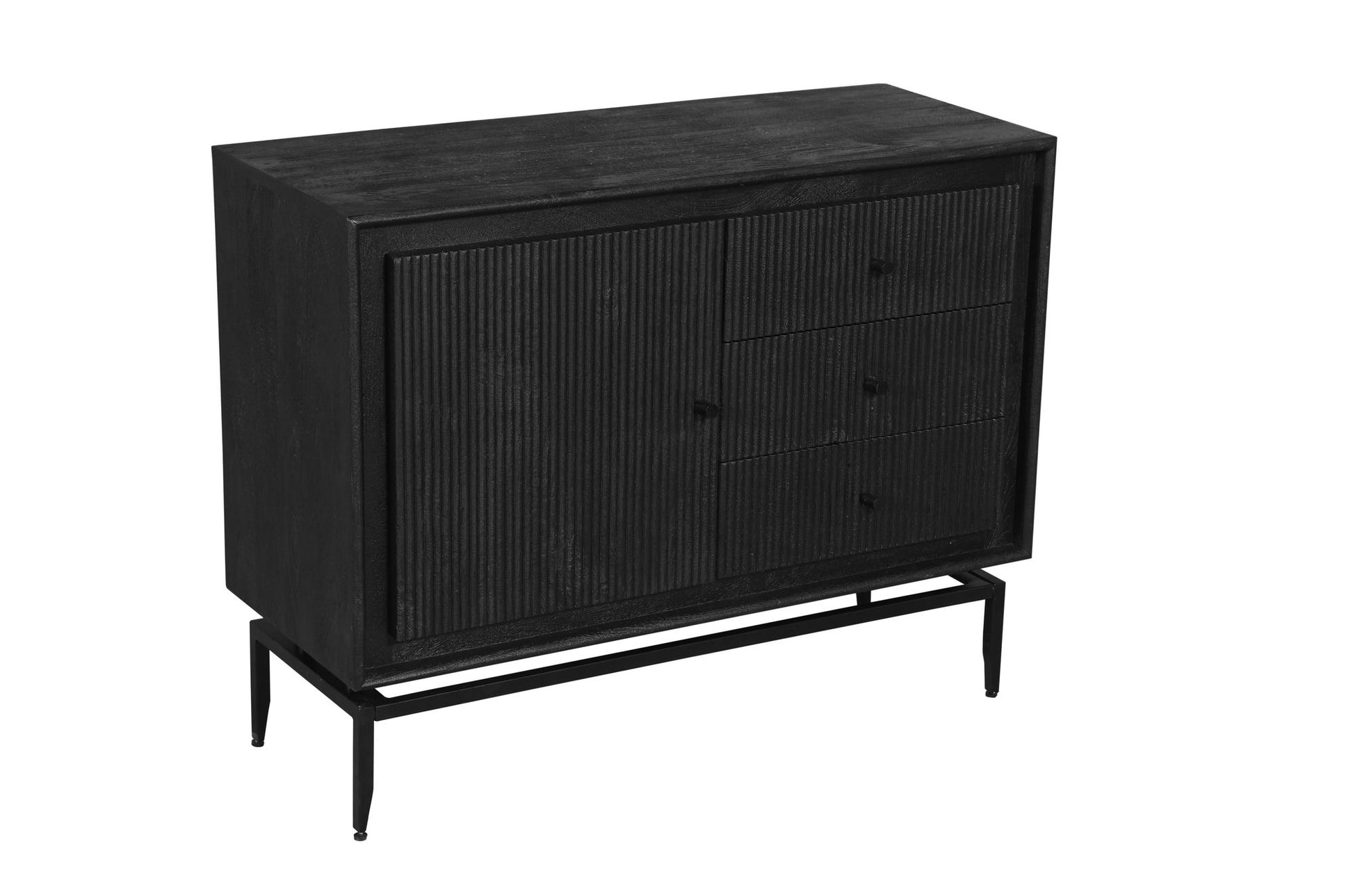 Refresh your space with this modern solid wood accent cabinet. Crafted from mango wood, this cabinet was designed with storage in mind. Three stacked drawers sit beside a large cabinet, all featuring fluted wood door fronts with black metal hardware. The black on black finish styles easily from modern, Scandinavian, bohemian and everything in between making this a stunning piece for any dining room, living room or bedroom