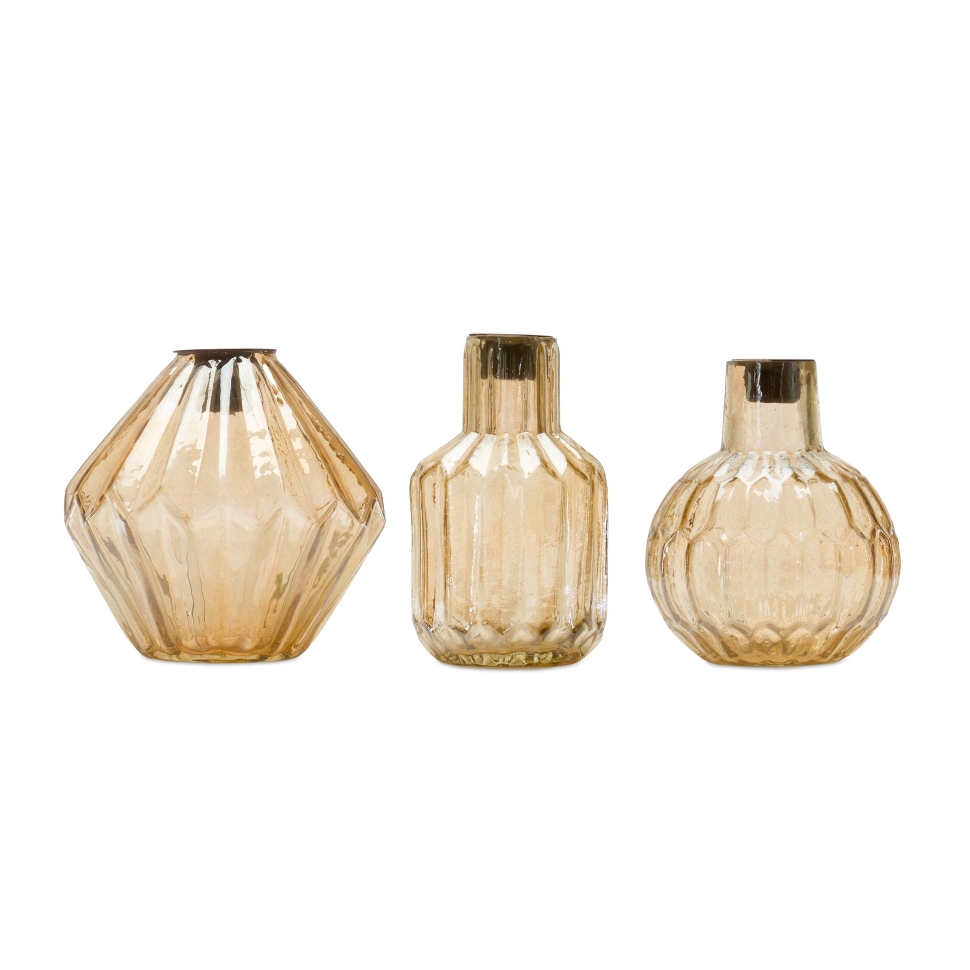 Add a chic-antique touch to your home with this beautiful set of Glass Candle Holders. Featuring three assorted designs, the warm orange tones paired with the ribbed glass design is the perfect combination to create a stunning display. The quality glass composition is sure to last for seasons to come. Complete the look by adding a candle taper to each piece. Candles sold separately. Featured in Melrose International's Modern Invitation collection.
