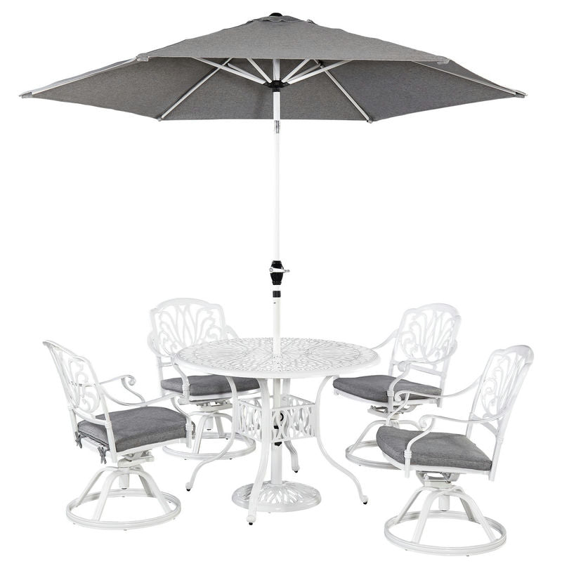 - This set consists of a round dining table, four swivel chairs with cushions, and an umbrella with stand.