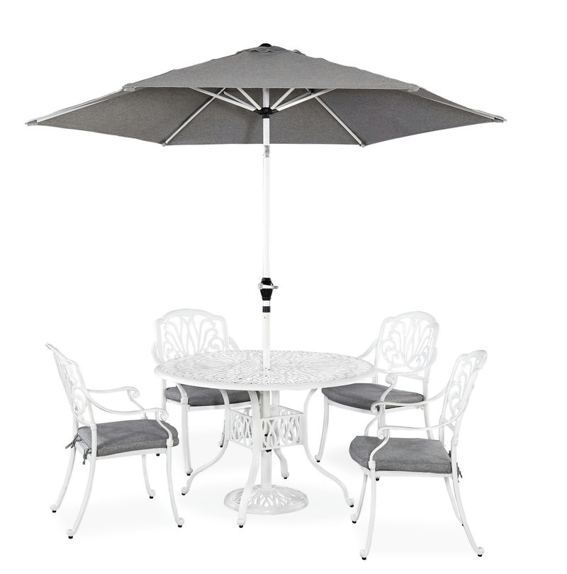 - This set consists of a round dining table, four arm chairs with cushions and an umbrella with stand.