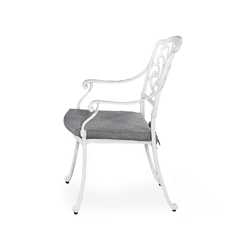 This Capri arm chair with cushion is made of cast aluminum with a powder-coated finish for a clean, crisp look. Add a Capri table to create a complete outdoor retreat. Both chairs are built to withstand the elements, from the cushions to the stainless-steel hardware.
