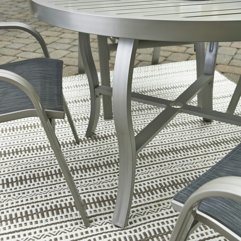 The Captiva 5-piece dining group includes a 42"D dining table and four arm chairs, all in a lightweight aluminum frame. The table features cross leg supports for added stability, and a center hole for an umbrella. The arm chairs feature contoured sling seat fabric with high backs.