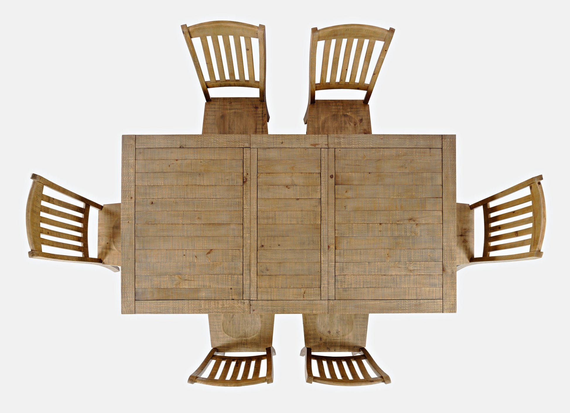 Rustic solid pine on a farmhouse pedestal and trestle base creates the perfect blend of classic and modern style with this Carlyle Crossing Seven Piece Dining Set. This set includes one extendable dining table, and six matching slat-back dining chairs. The base with cross-beam supports are naturally distressed with plenty of character, and a table top with a unique framed corner design adds a unique cottage flair. Each table includes one removable 18" extension leaf to bring the table to a maximum length of 78" and perfect for extra seating when entertaining guests or larger family dinners.