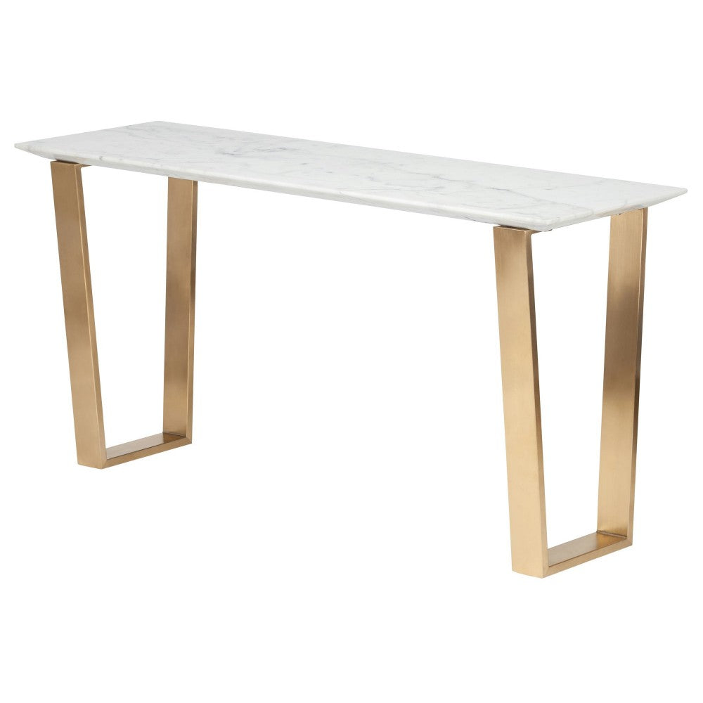 The Catrine console is a striking example of elegant contemporary design. Bold modern lines define the Catrine pairing a cool textured marble table top with brilliant gold brushed stainless steel legs presenting a sophisticated urban aesthetic. Each piece of marble is expertly crafted out of a unique piece of natural stone, creating beautiful variations and one-of-a-kind details.