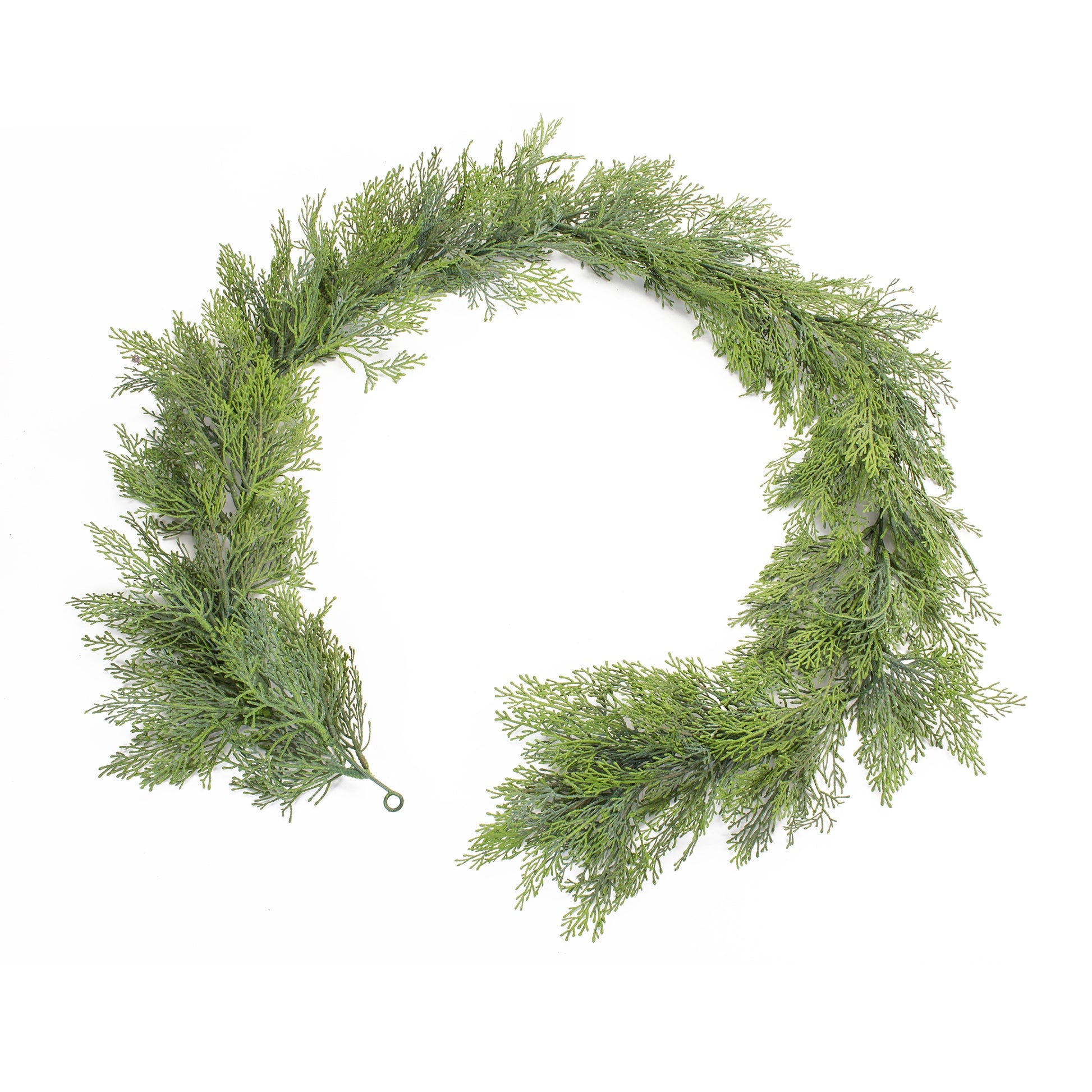 Add a pop of natural color to your holiday decor with this beautiful set of Cedar Garlands. Featuring two pieces, this set would make a great addition to your Christmas centerpiece or mantle decor. The trendy cedar foliage paired with the quality plastic composition is the perfect combination to create a stunning Christmas display. Measuring 6ft in length each, thie set is sure to make a statement in your home.