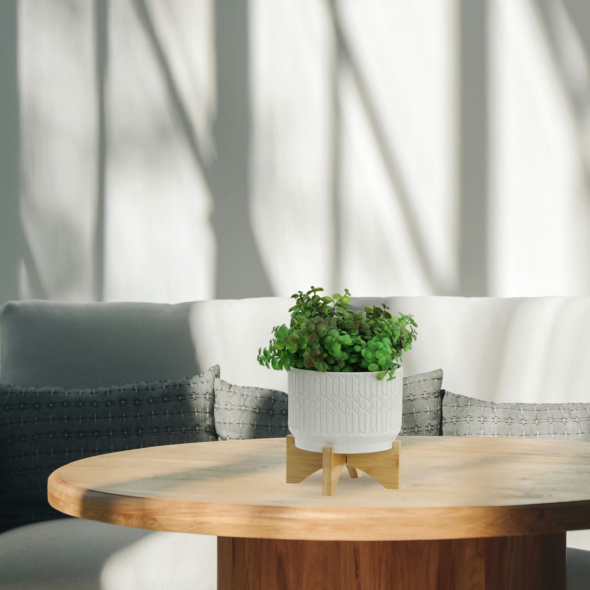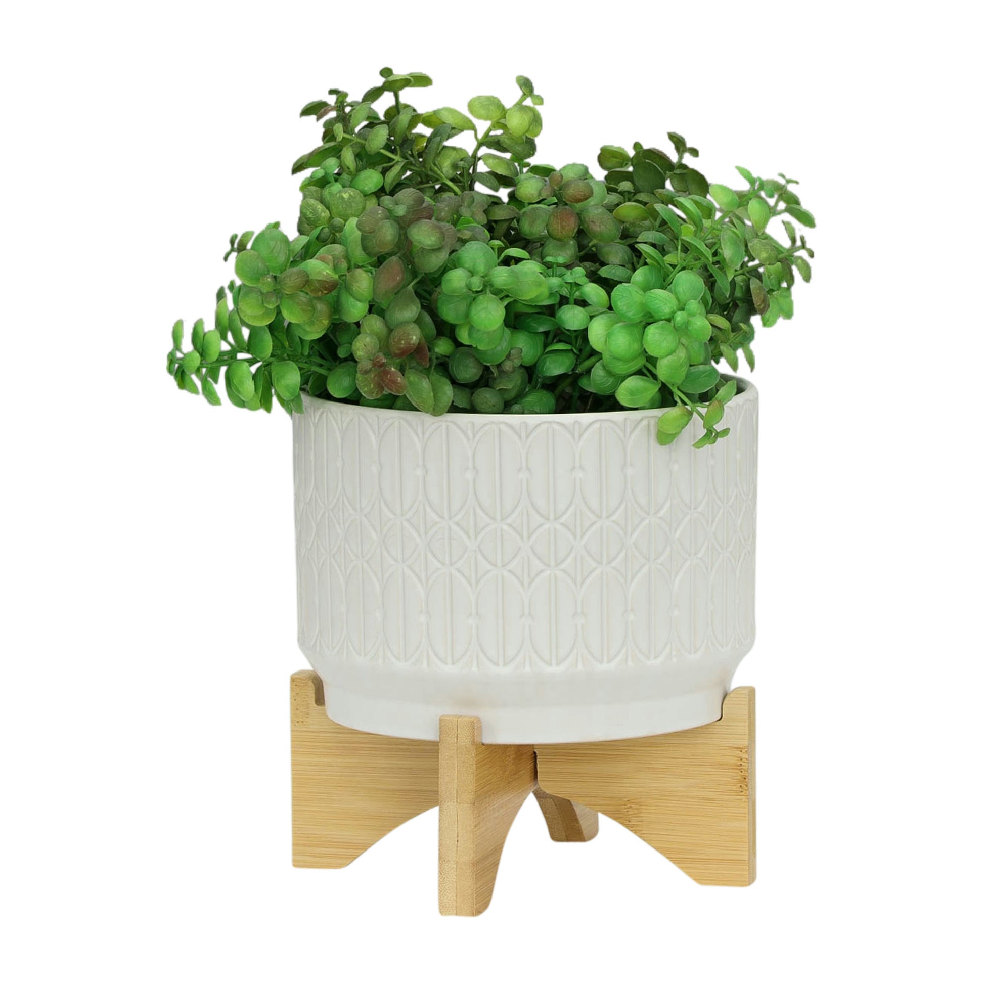 Ceramic planter with abstract triangles design on the exterior. It has a non-glossy finish and the wood stand is glued to the planter. This beautiful piece will be a great addition to your living room or entry way.Sagebrook Home has been formed from a love of design, a commitment to service and a dedication to quality. They create and import fashion forward items in the most popular design styles. Backed with years of experience in the textile field, They are now providing a complete Home decor story. the combination of wall decor, furniture, lighting and Home accessories are all coordinated with textiles to provide a complete Home look. Sagebrook Home is committed to providing the best Home decor and accent pieces at value prices.