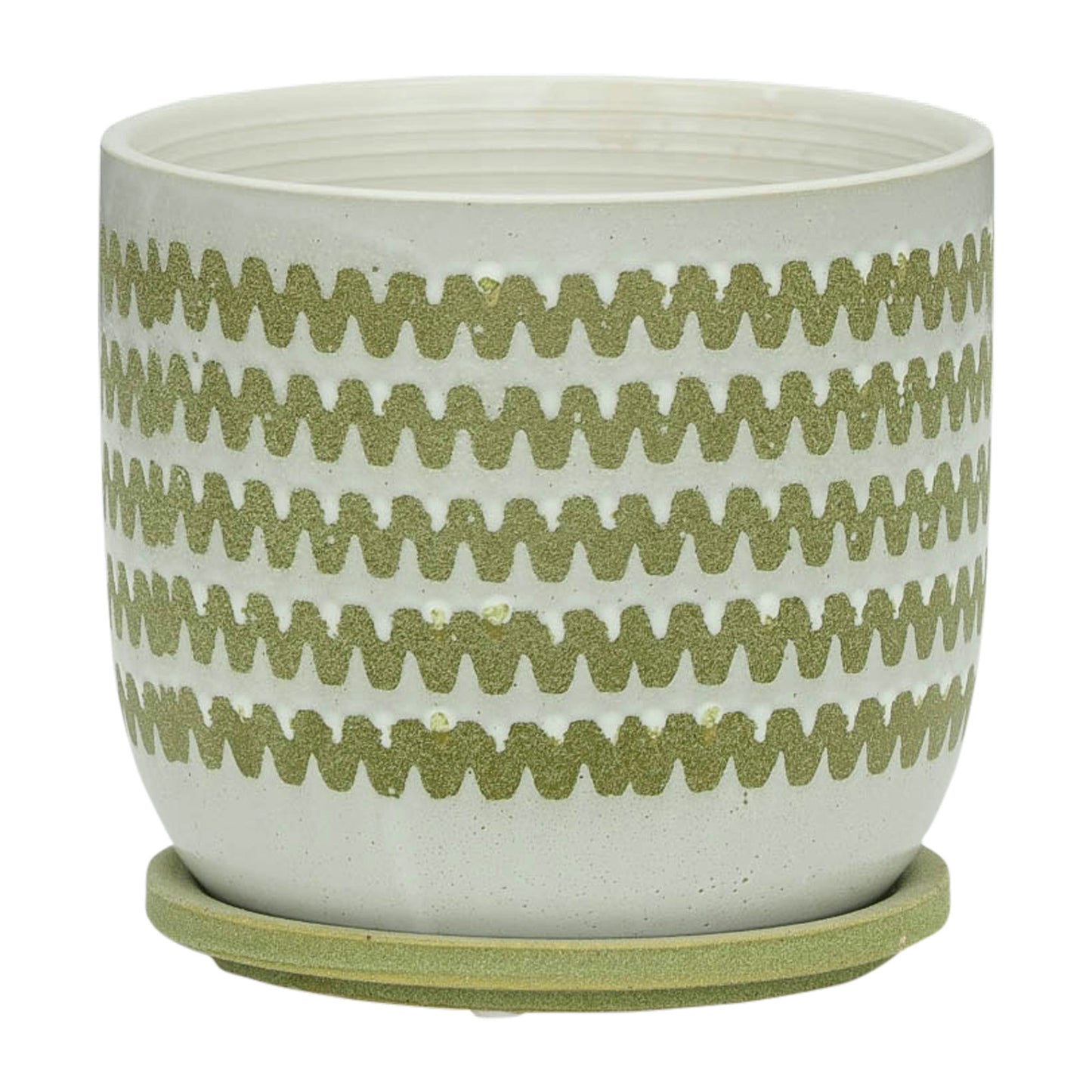 Cer, 8" Zigzag Planter W/ Saucer, Olive