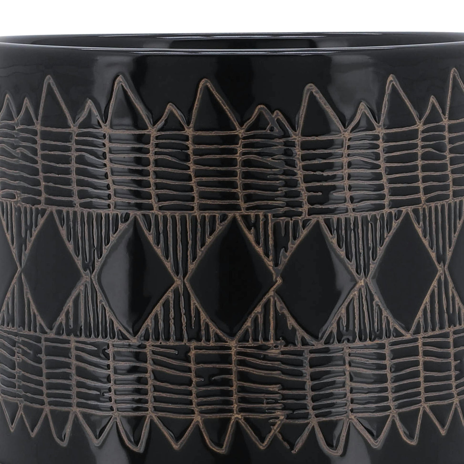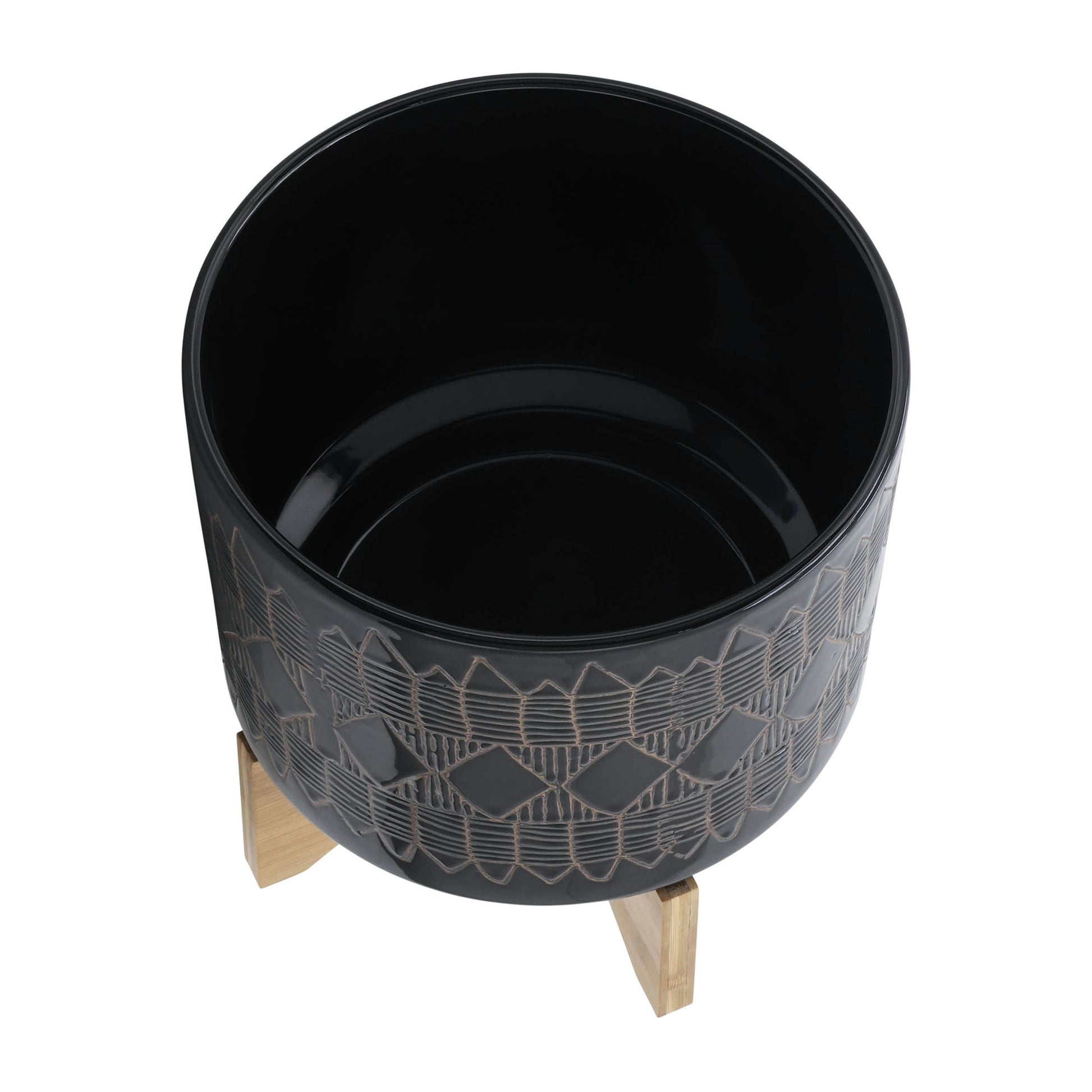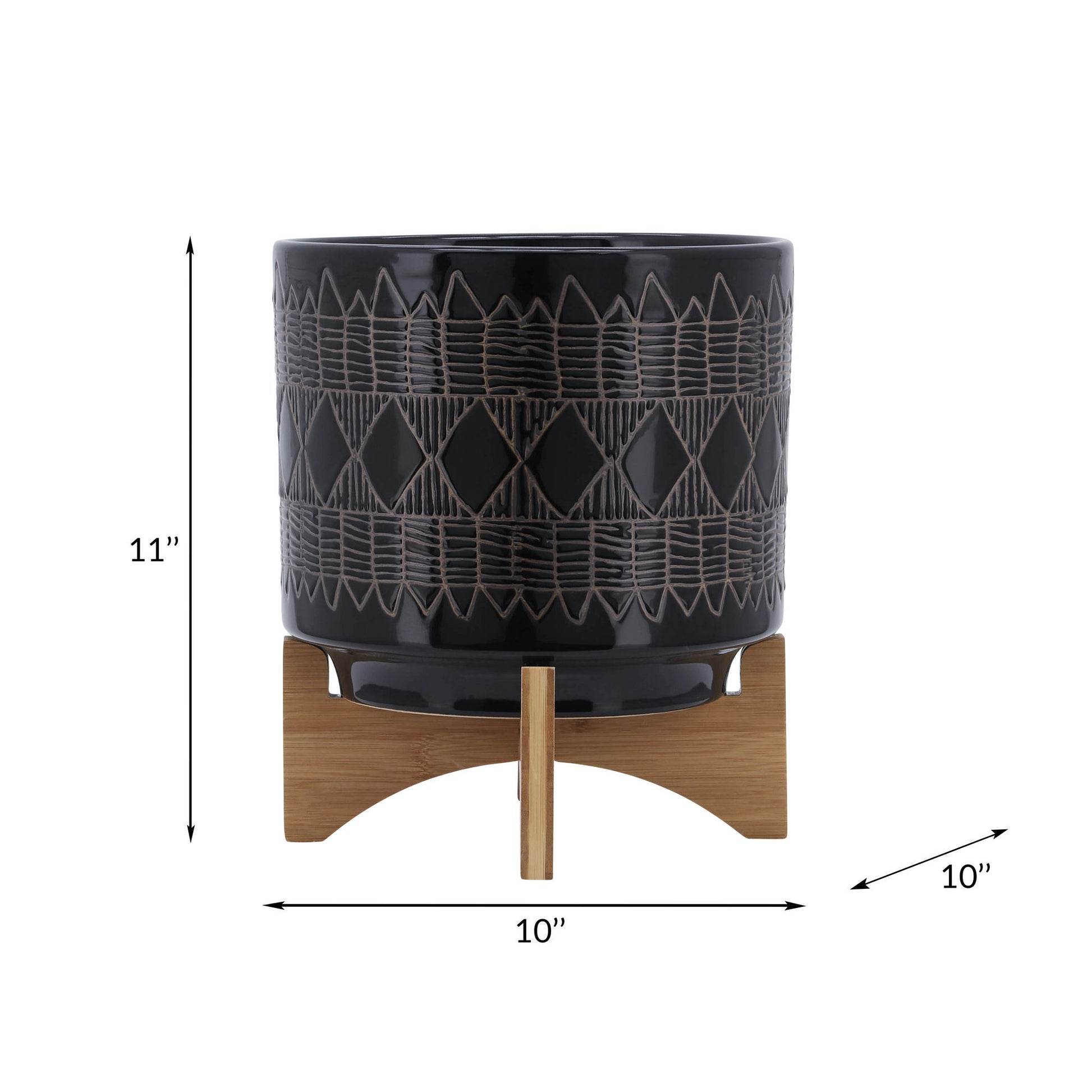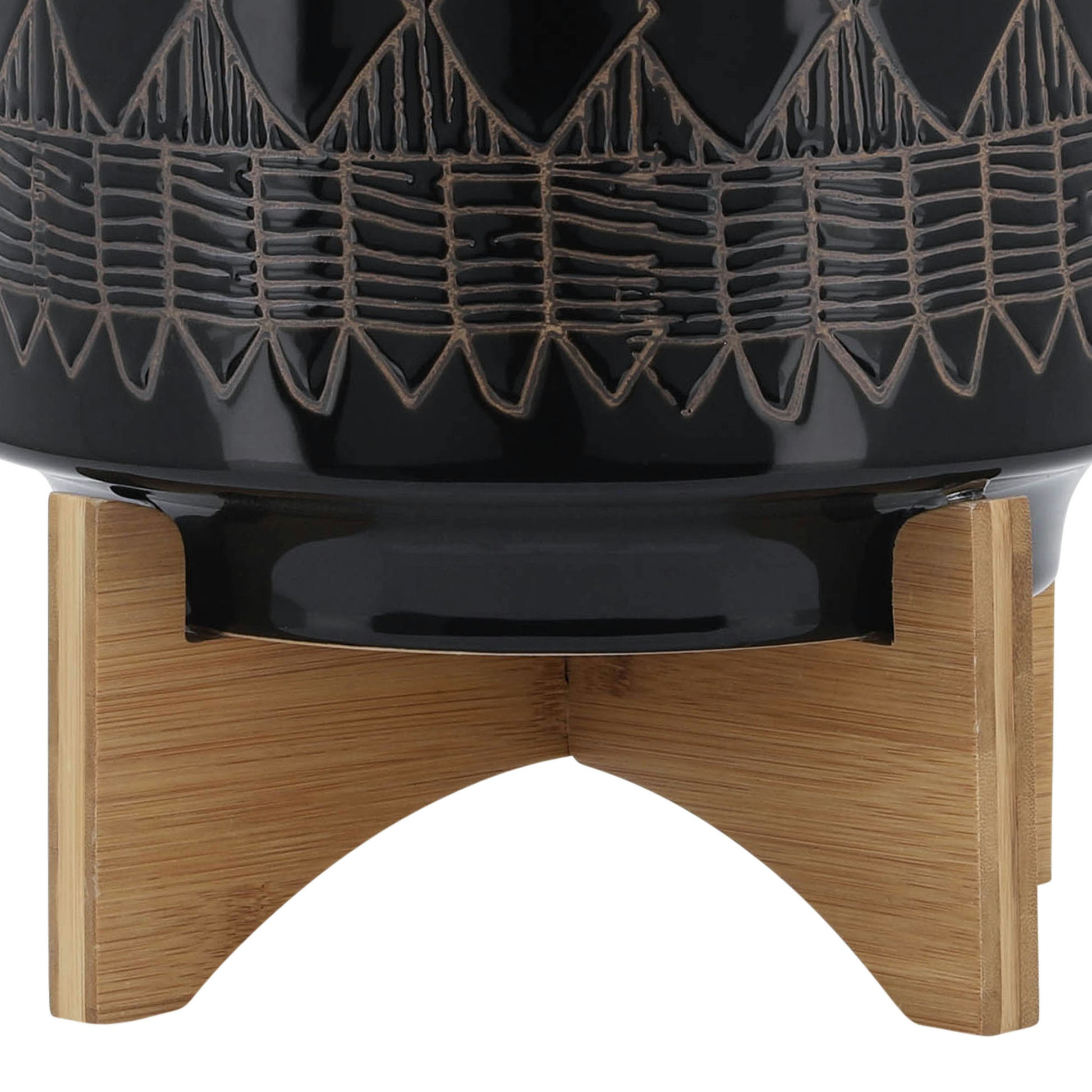 Ceramic 10" Aztec Planter On Wooden Stand, Black