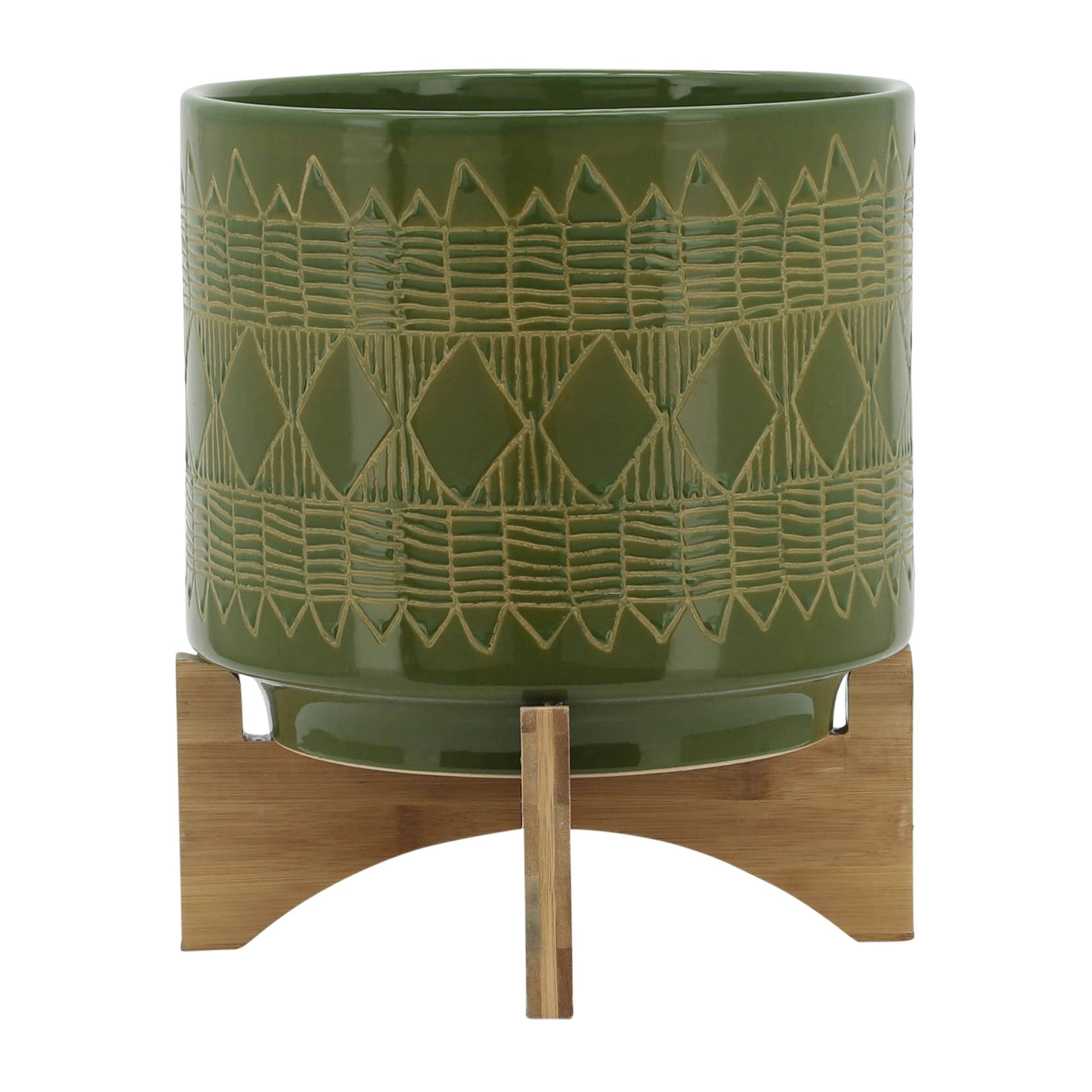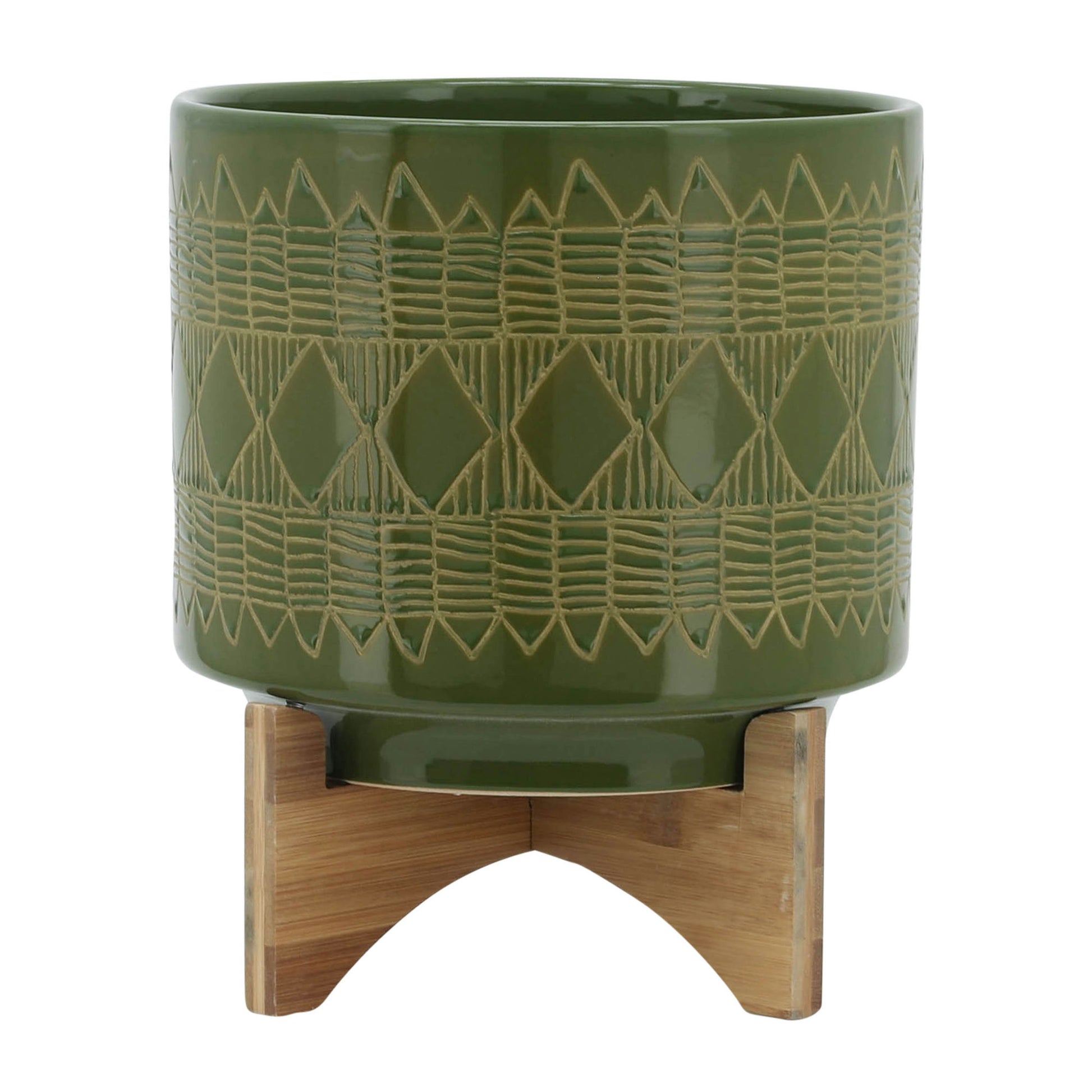 Ceramic 10" Aztec Planter On Wooden Stand, Olive