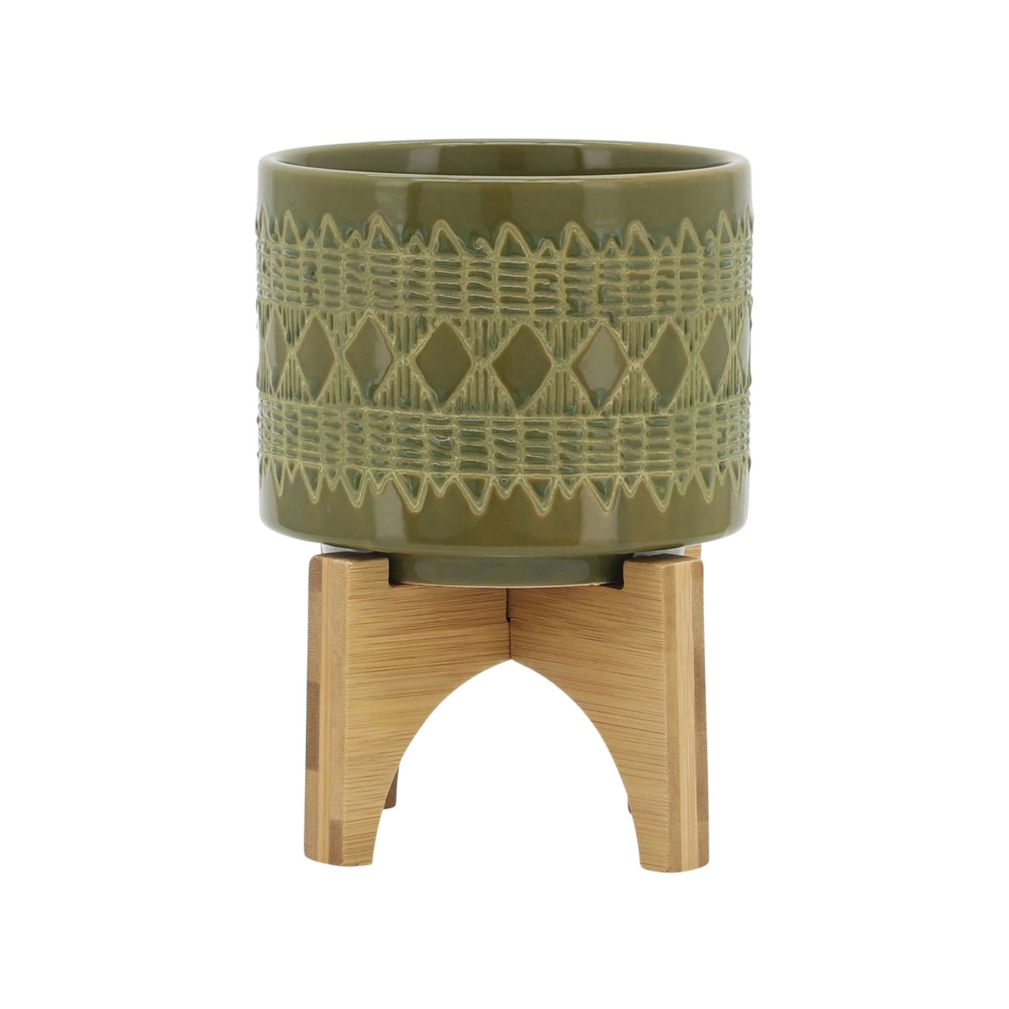 Ceramic 5" Aztec Planter On Wooden Stand, Olive
