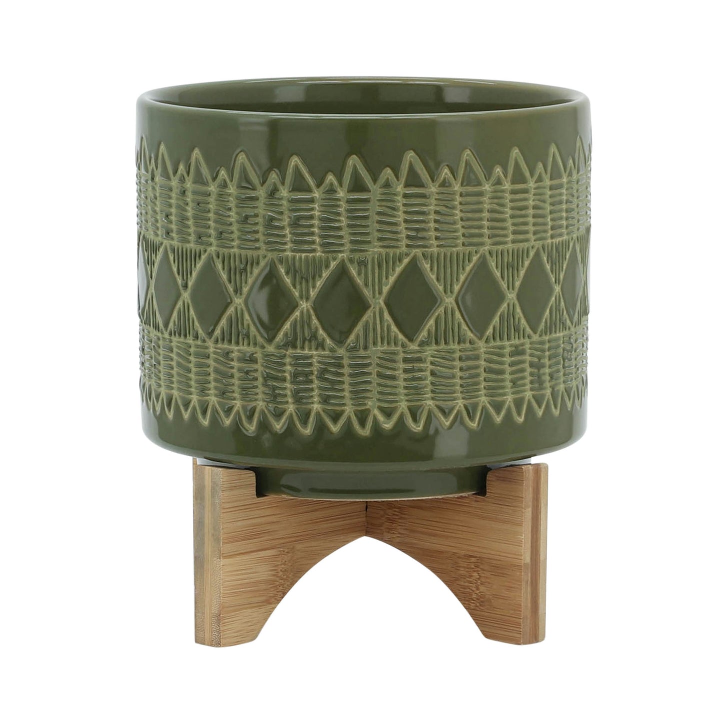 Ceramic 8" Aztec Planter On Wooden Stand, Olive