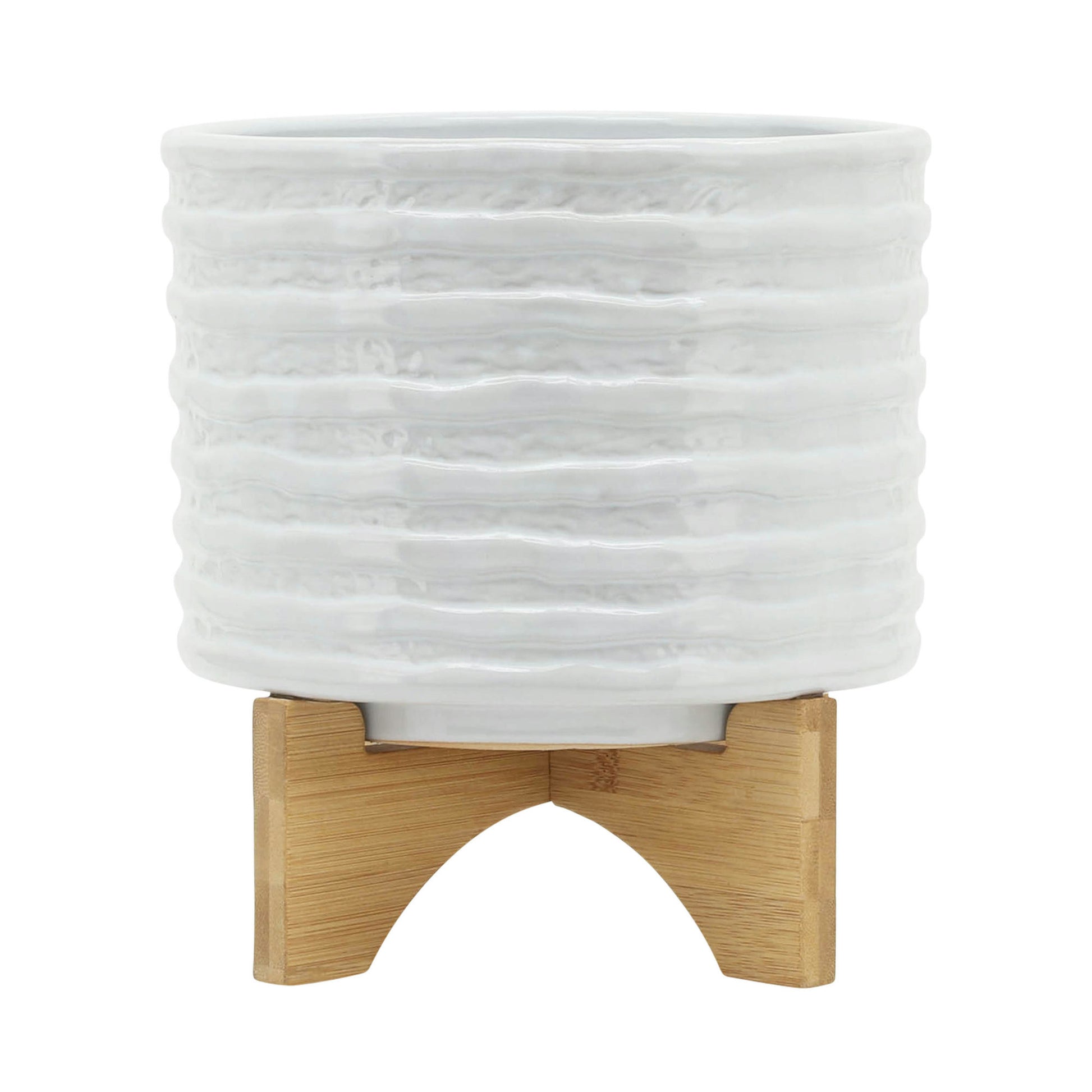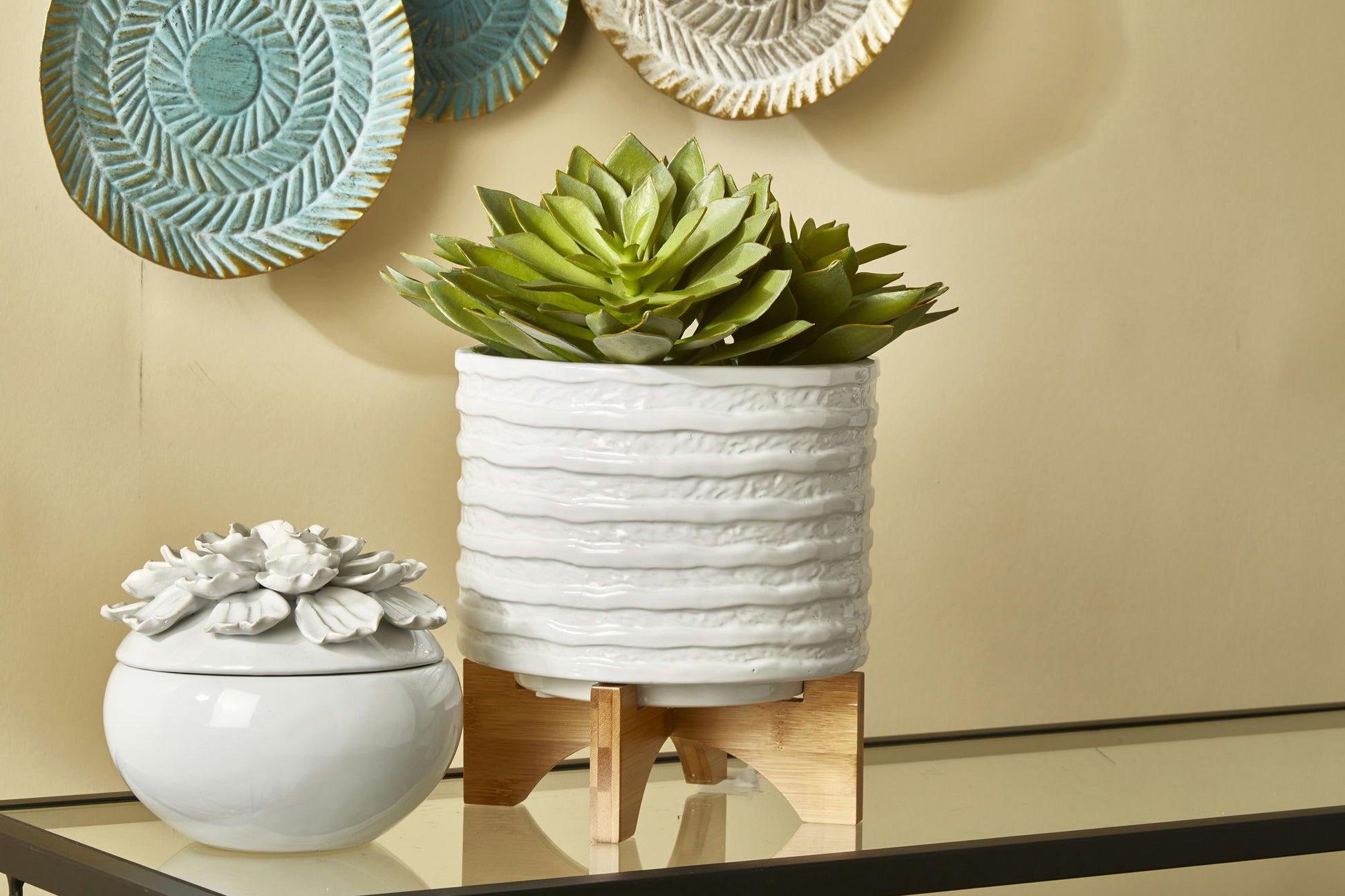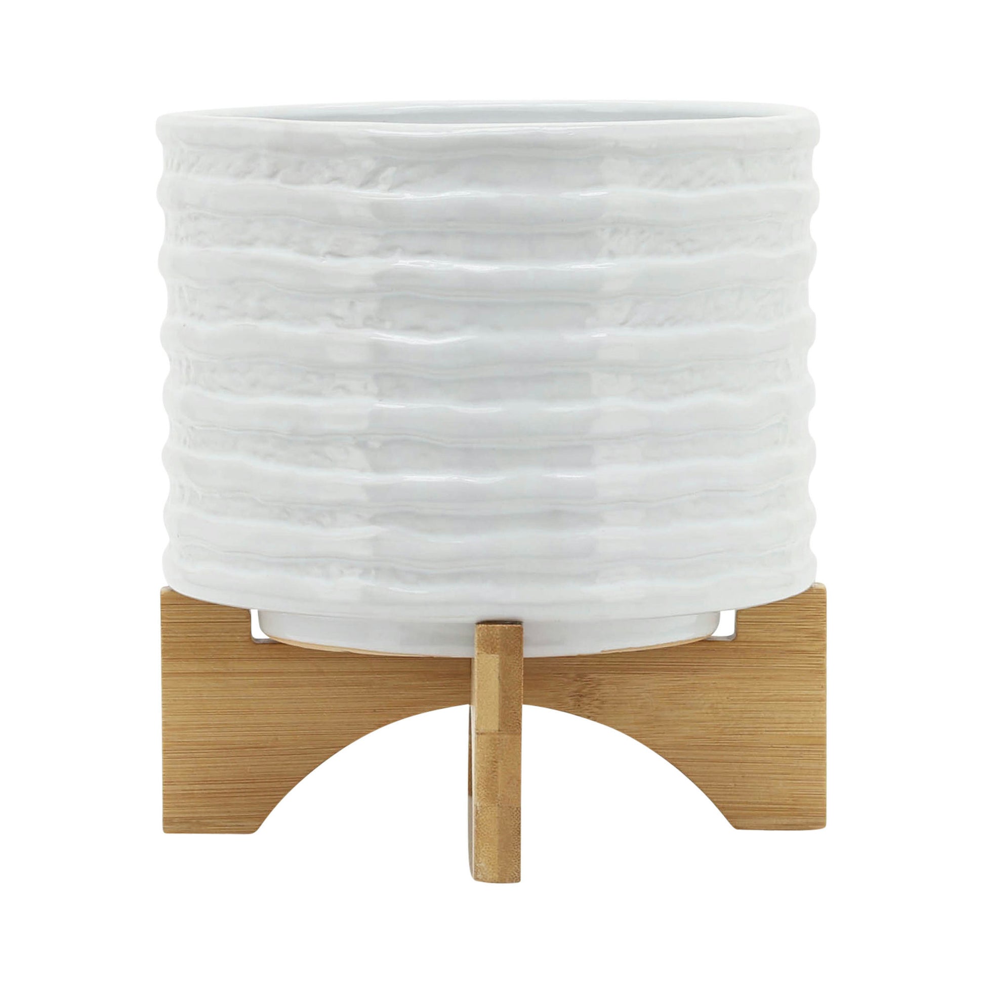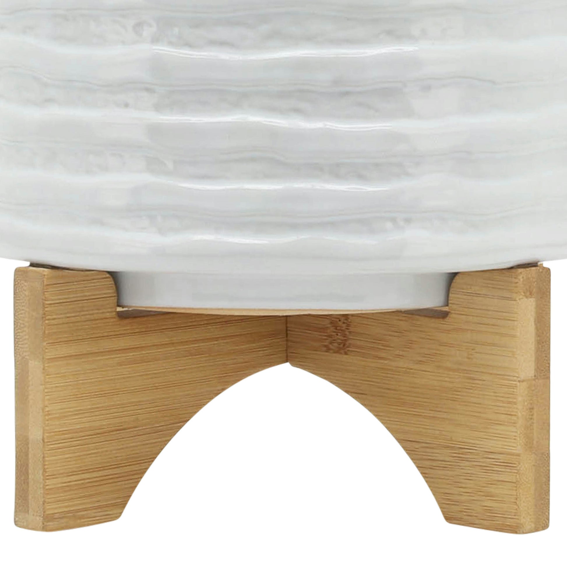 Be proud of your garden by accessorizing all your favorite plants with this stylish white ceramic pot. The vessel is being held up by a wood stand ad has a ridged design in the exterior. There is no drainage hole, guaranteed to not have a mess.Sagebrook Home has been formed from a love of design, a commitment to service and a dedication to quality. They create and import fashion forward items in the most popular design styles. Backed with years of experience in the textile field, They are now providing a complete Home decor story. the combination of wall decor, furniture, lighting and Home accessories are all coordinated with textiles to provide a complete Home look. Sagebrook Home is committed to providing the best Home decor and accent pieces at value prices.