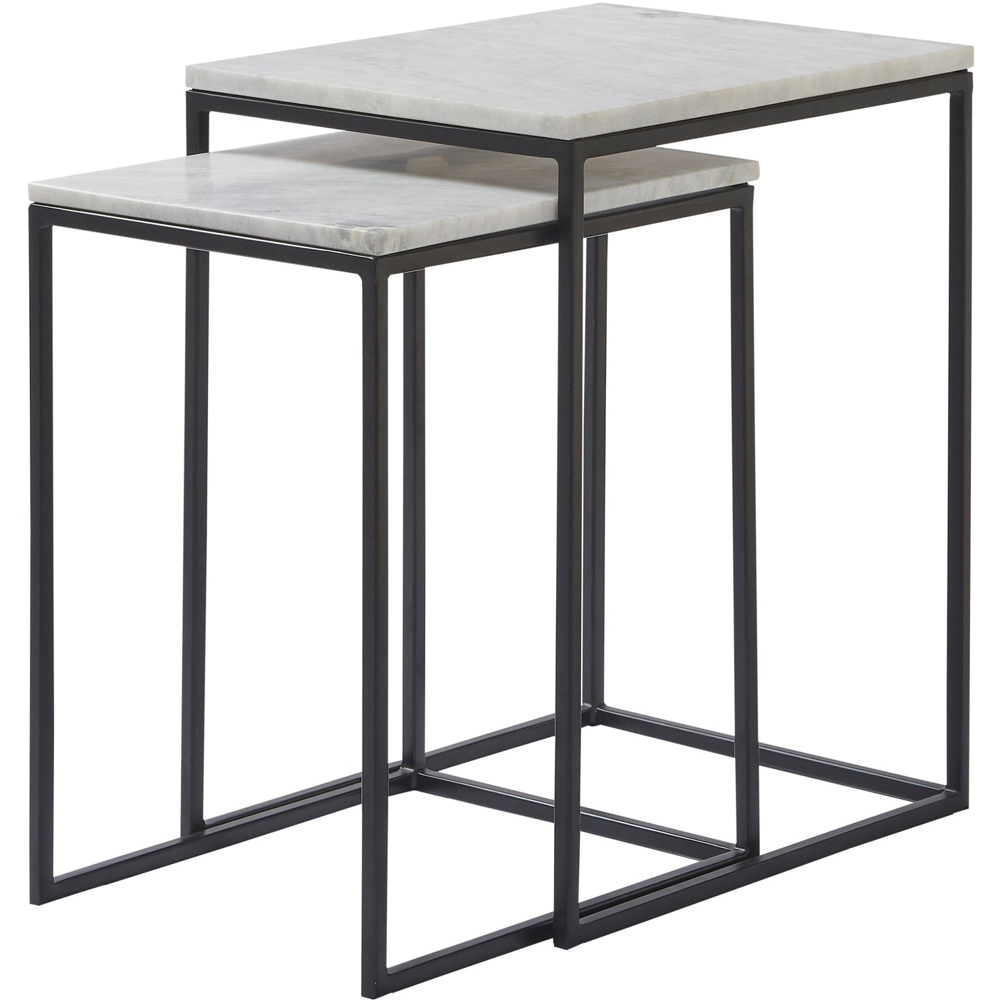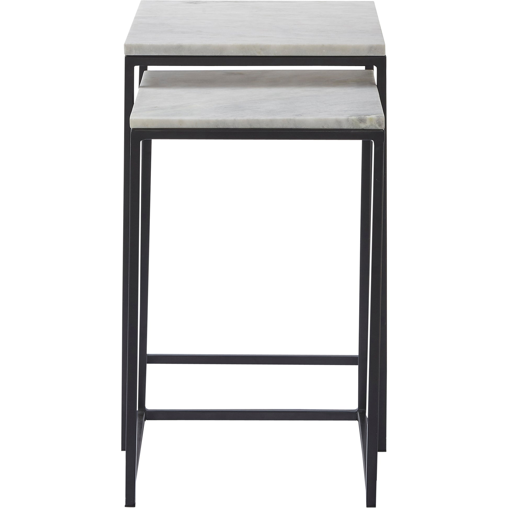 This set of outdoor nesting tables brings the captivating quality of contemporary design outside. Constructed of black powder coated metal and white marble, it has an inherently chic quality that sets the tone for the outdoor living space. The table's two different heights and nesting structure offers convenience and continuous use in a variety of set ups.