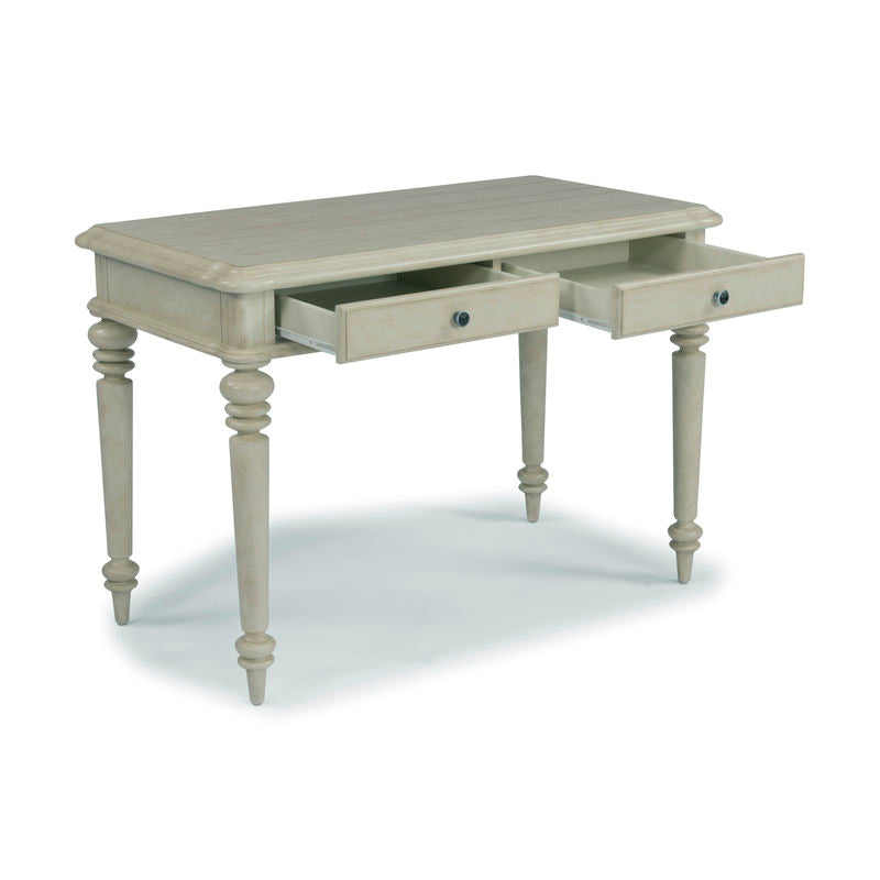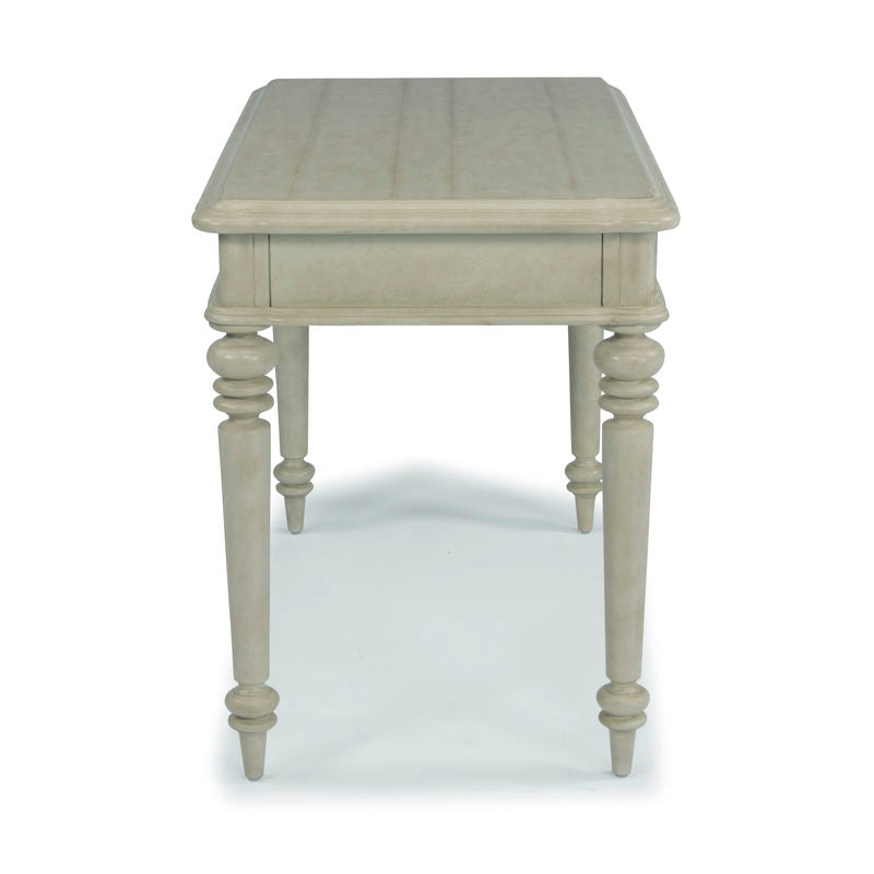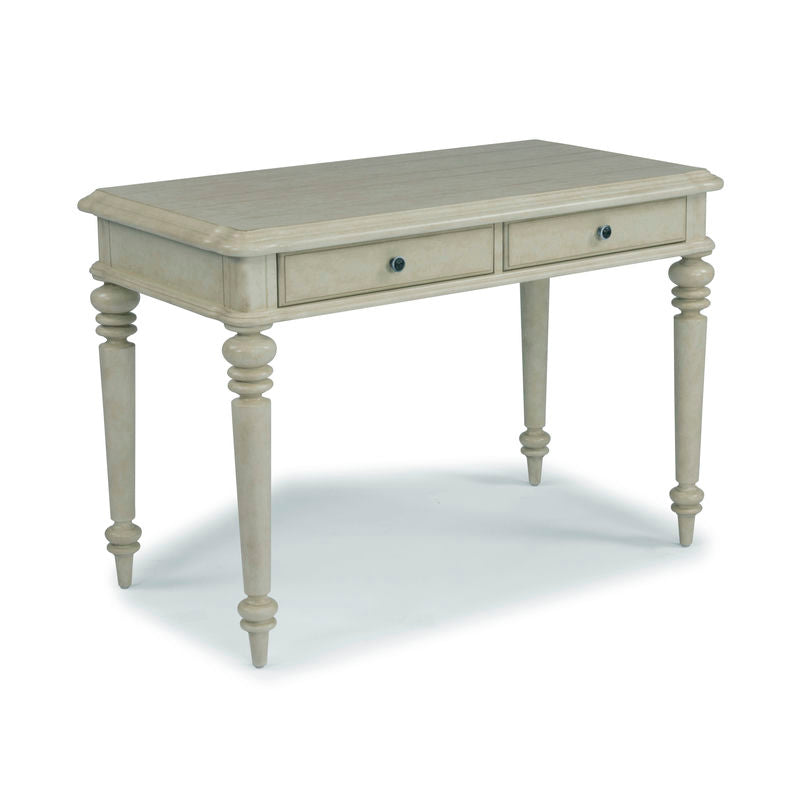 Find French farm-house charm in this Chambre Desk by homestyles. Crafted of hardwood solids and mahogany veneers with engineered wood. A hand-applied, aged, off-white painted parchment finish and plank top add character. Features carved turned legs and finished on all four sides, so it can be used in the center of a room. Two lap storage drawers with raised-panel fronts and aged nickel-finished drawer pulls. Arrives at your door by parcel delivery service. Finish and measurements may vary. Assembly required. Measures: 30"H x 44"W x 24"D.