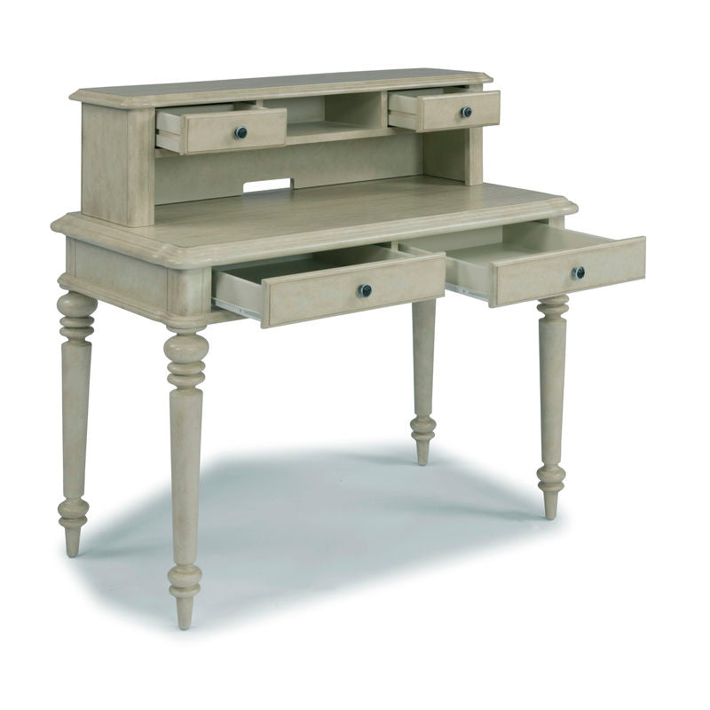 Find French farm-house charm in this Chambre Desk with Hutch by homestyles. Crafted of hardwood solids and mahogany veneers with engineered wood. A hand-applied, aged, off-white painted parchment finish and plank top add character. Features carved turned legs and finished on all four sides, so it can be used in the center of a room. Two lap storage drawers and two hutch drawers feature raised-panel fronts and aged nickel-finished drawer pulls. The hutch has a cut-out for electrical cord access. Arrives at your door by parcel delivery service. Finish and measurements may vary. Assembly required. Measures: 41.25"H x 44"W x 24"D.