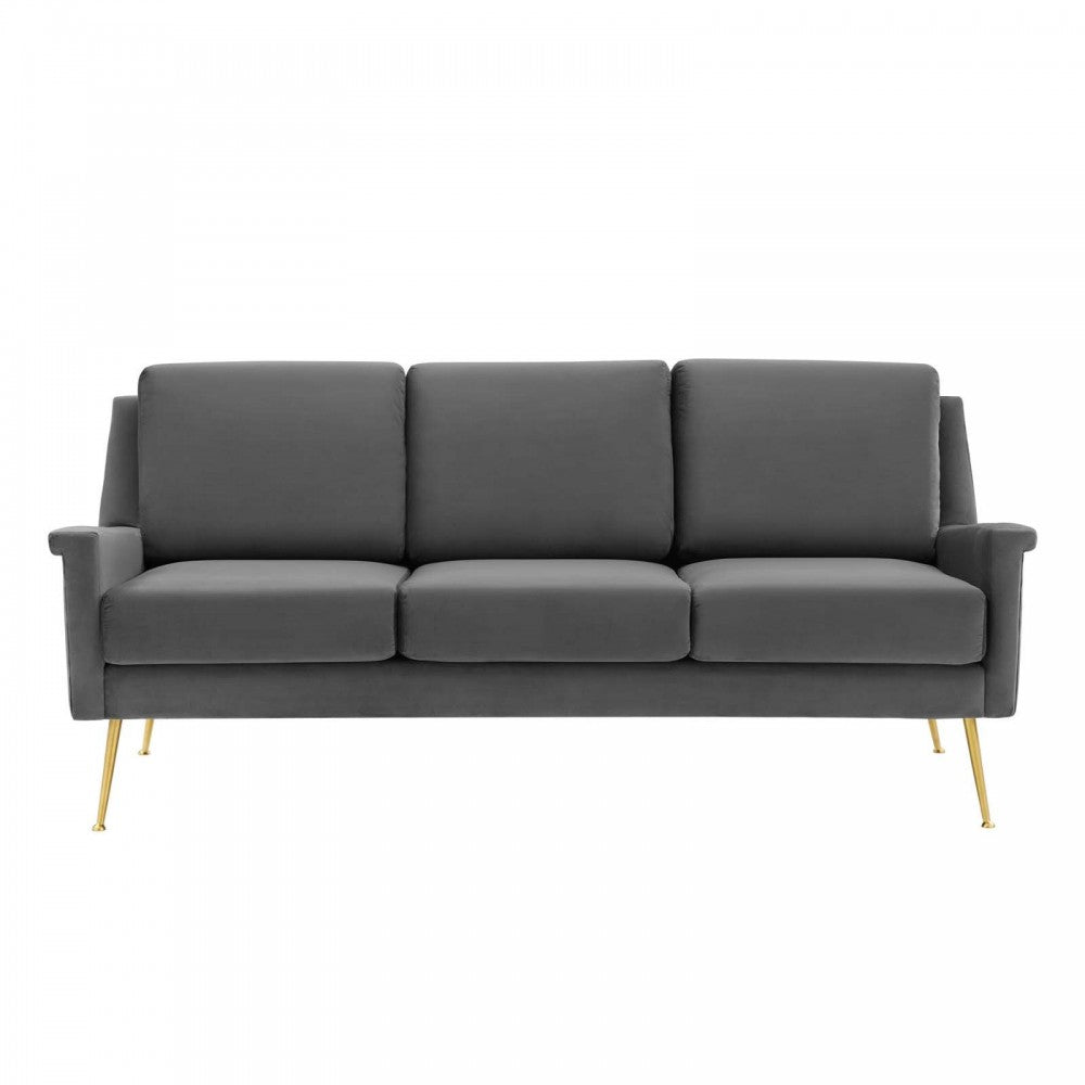 Redefine your living space with the modern design and glam deco style of the Chesapeake Performance Velvet Sofa. Featuring a tailored profile and subtle flared silhouette, this velvet sofa refreshes a living room, den, office, or bedroom sitting area. Offering a luxurious seating experience, this sofa is upholstered in stain-resistant performance velvet and padded with dense foam for ultimate comfort. Resting atop brushed gold stainless steel legs, this living room sofa is crafted with solid wood and plywood and supports up to 600 lbs.