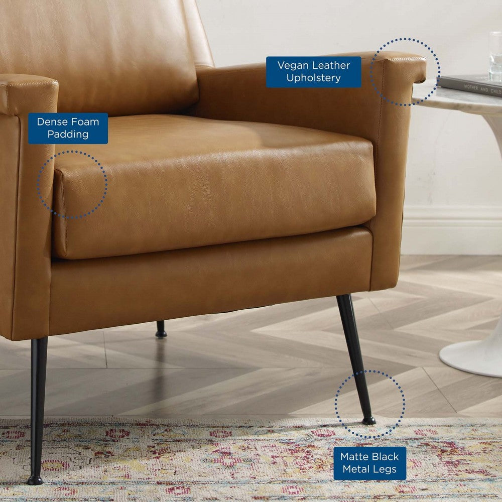 Redefine your living space with the modern design and glam deco style of the Chesapeake Vegan Leather Accent Armchair. Featuring a tailored profile and subtle flared silhouette, this vegan leather chair refreshes a living room, entryway, den, office, or bedroom sitting area. Offering a luxurious seating experience, this accent chair is upholstered in durable vegan leather and padded with dense foam for ultimate comfort. Resting atop matte black metal legs, this living room armchair is crafted with solid wood and plywood and supports up to 300 lbs.