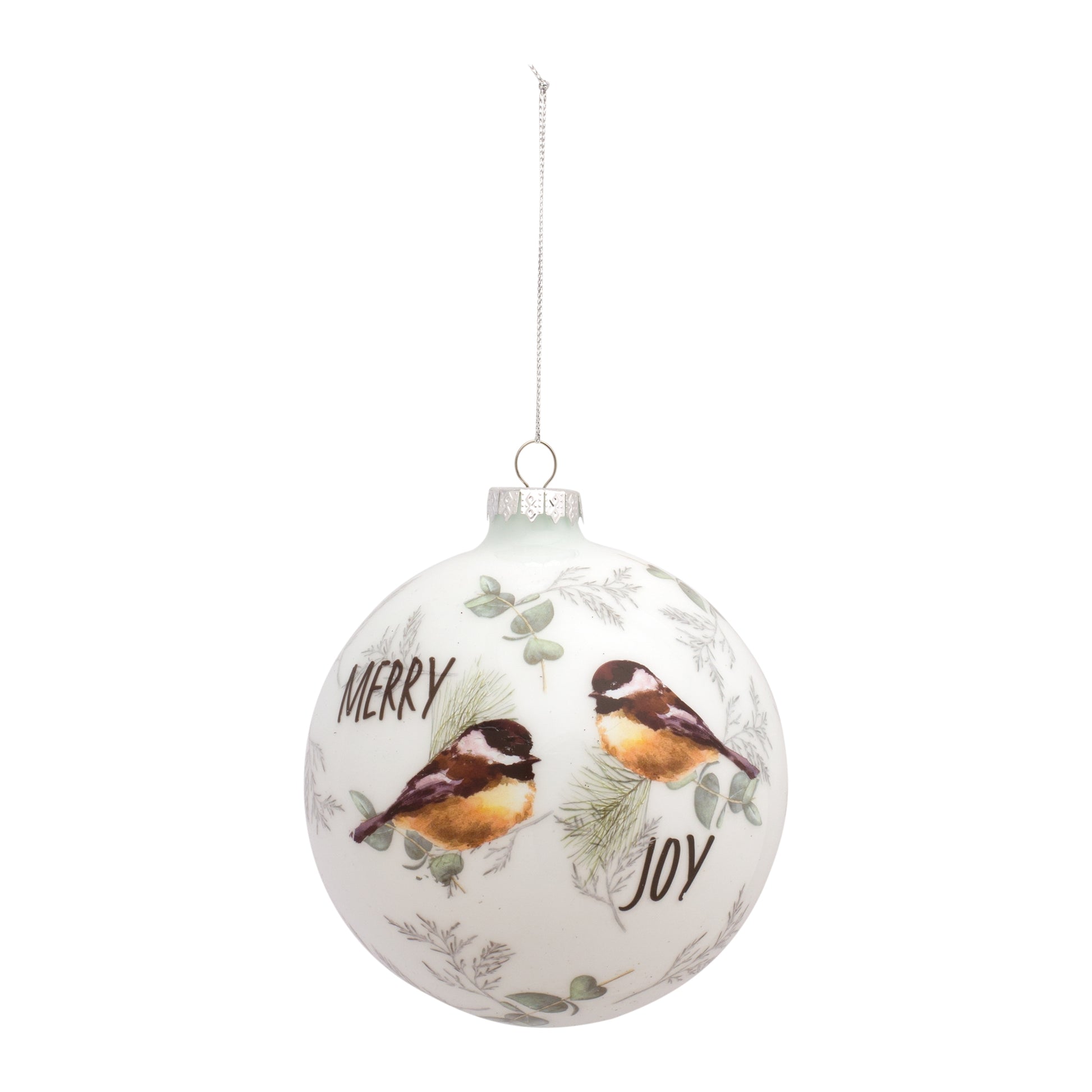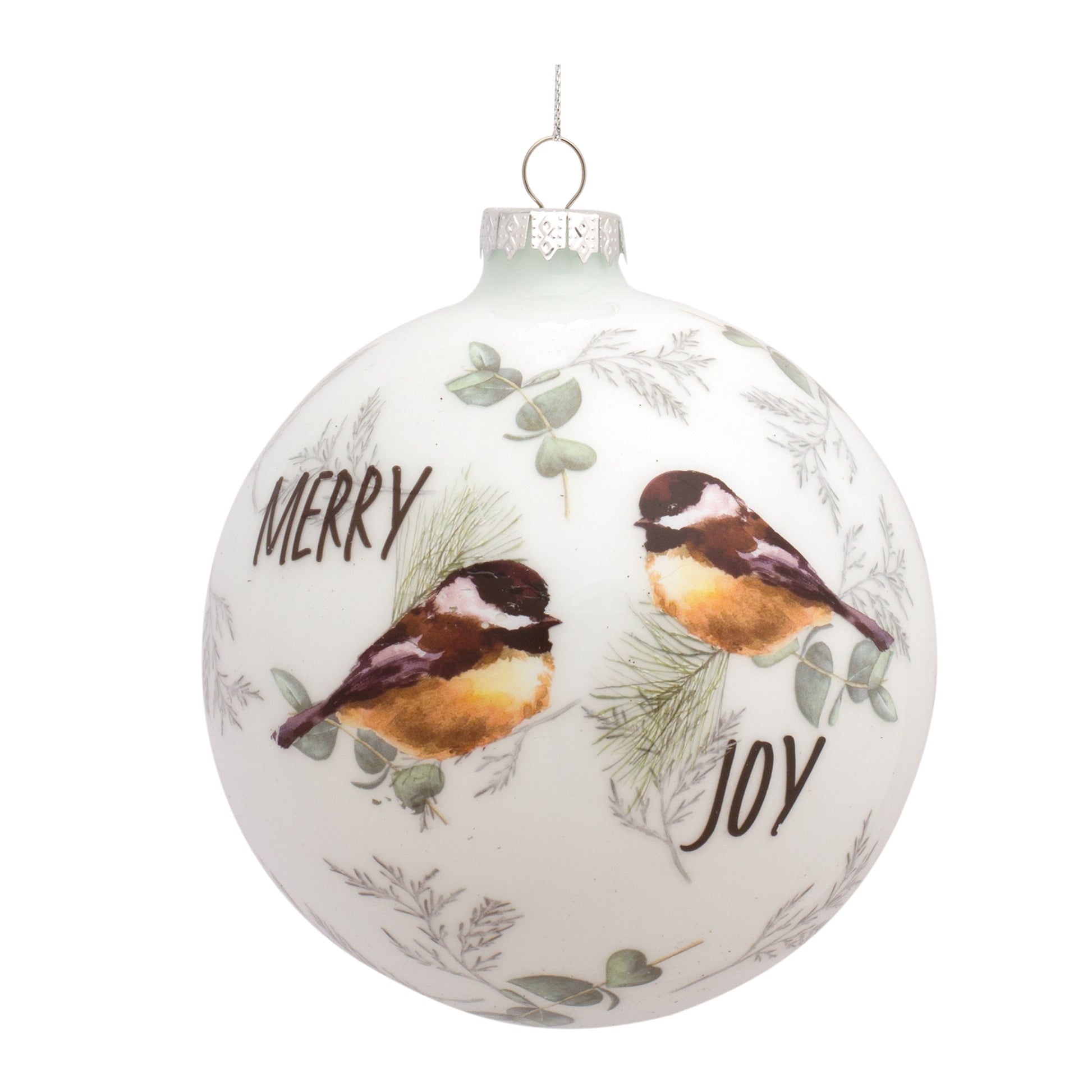 Adorn your Christmas Tree with this beautiful set of Chickadee Ball Ornaments. Featuring the sentiments "Merry" and "Joy", the delicate painted bird artwork paired with soft green foliage accents makes this set the perfect addition to your holiday tree decor. The pieces can be used as gifts for friends to cherish, or you can display the set on your own Christmas tree and enjoy them for years to come.