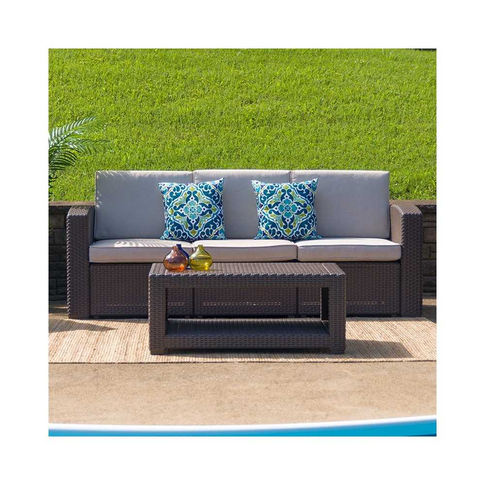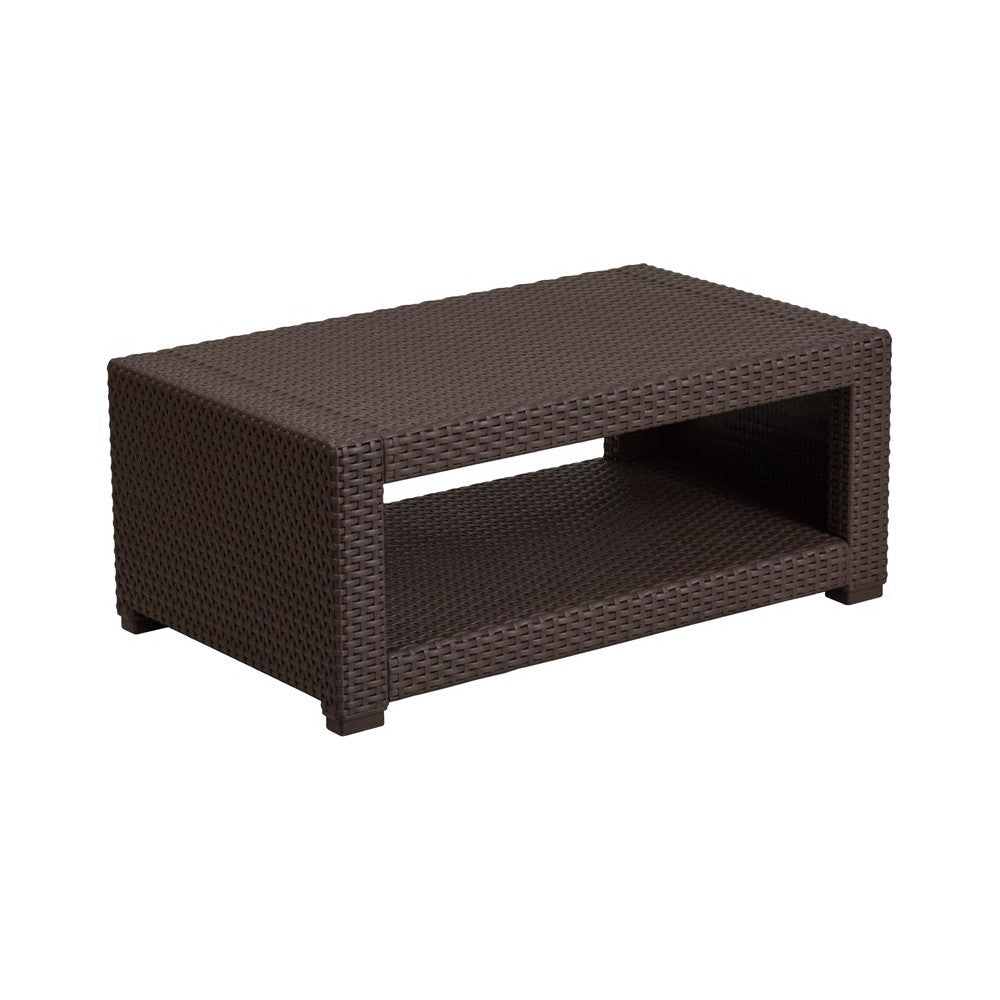 Complete your outdoor arrangement with this chocolate brown accent coffee table and add depth and texture to your outdoor look with a vase of summer flowers, some nautical decor or colorful glass sculptures. The durable resin frame offers a stylish appearance which replicates rattan giving you the perfect place to rest your wine glass or your tired feet. This richly colored table features a lower shelf for storing plates and glasses or your pool towels and sunscreen. No matter how you use it this table is a must have. [DAD-SF1-R-GG]