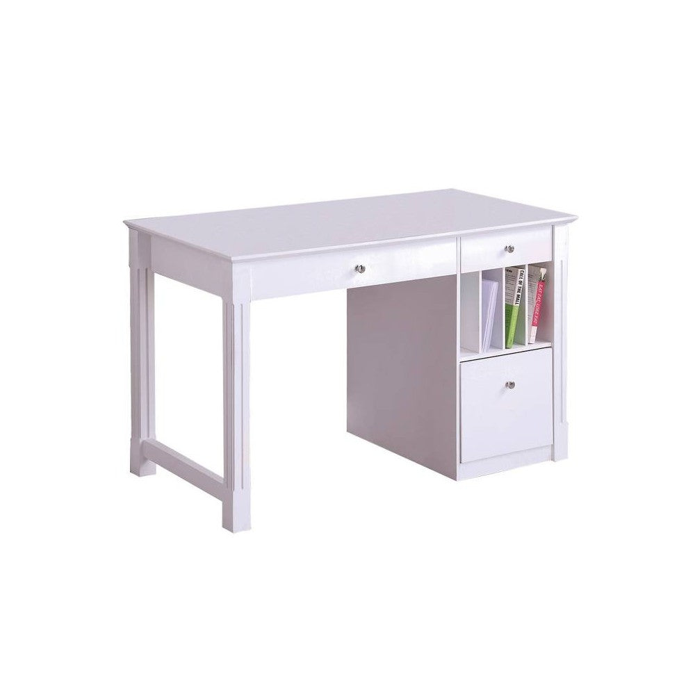 Improve your work space with this classic wood desk, so you can have a place to organize all your work-related items. This computer desk is constructed from warp-resistant MDF with a beautiful, painted finish. Features a drop-down keyboard tray, hanging filing drawer, and file slots to provide you ample storage space. Ideal for your home office or in a corner of your home giving your space a modern appeal.