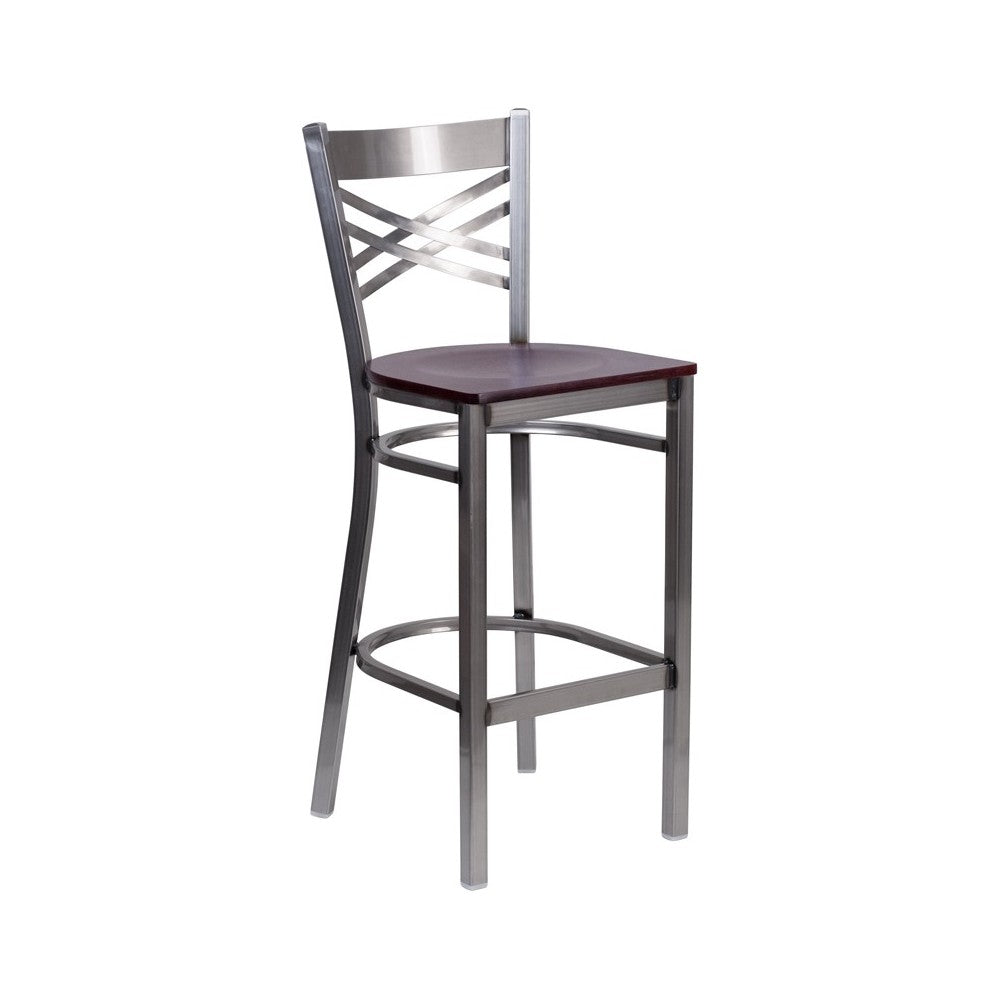 Clear Coated ''X'' Back Metal Restaurant Barstool - Mahogany Wood Seat