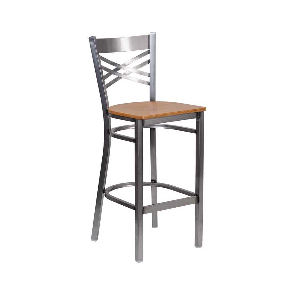 Create a first-rate dining experience by offering your patrons great food, service and attractive furnishings. Metal bar stools are a popular choice for furnishing restaurants, lounges, pool halls, bars and other high traffic establishments. This stool is easy to clean, which is an important aspect when it comes to a business. Built to withstand the everyday hustle and bustle in the restaurant and hospitality business, these dining stools will also look great in your home. The beautiful wood seat and "X" back design will keep guests comfortable. The frame is stabilized using welded joint assembly and two curved support bars which includes a footrest to improve posture. The floor glides help protect your floors and ensure smooth gliding. Use this stool in your dining room or home bar to give your decor a fresh look. The simple and lightweight design of this chair is a must have, whether used in the home or your commercial business. [XU-6F8B-CLR-BAR-NATW-GG]
