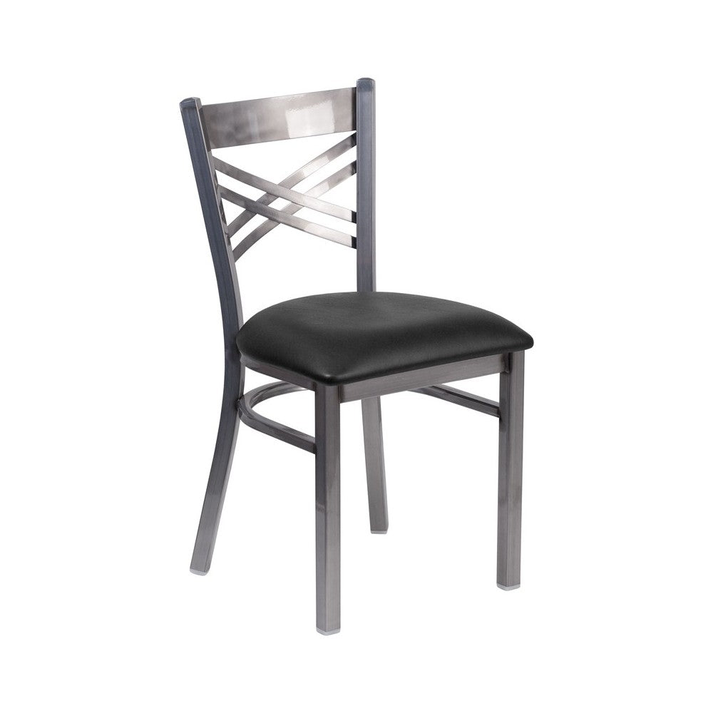 Clear Coated ''X'' Back Metal Restaurant Chair - Black Vinyl Seat