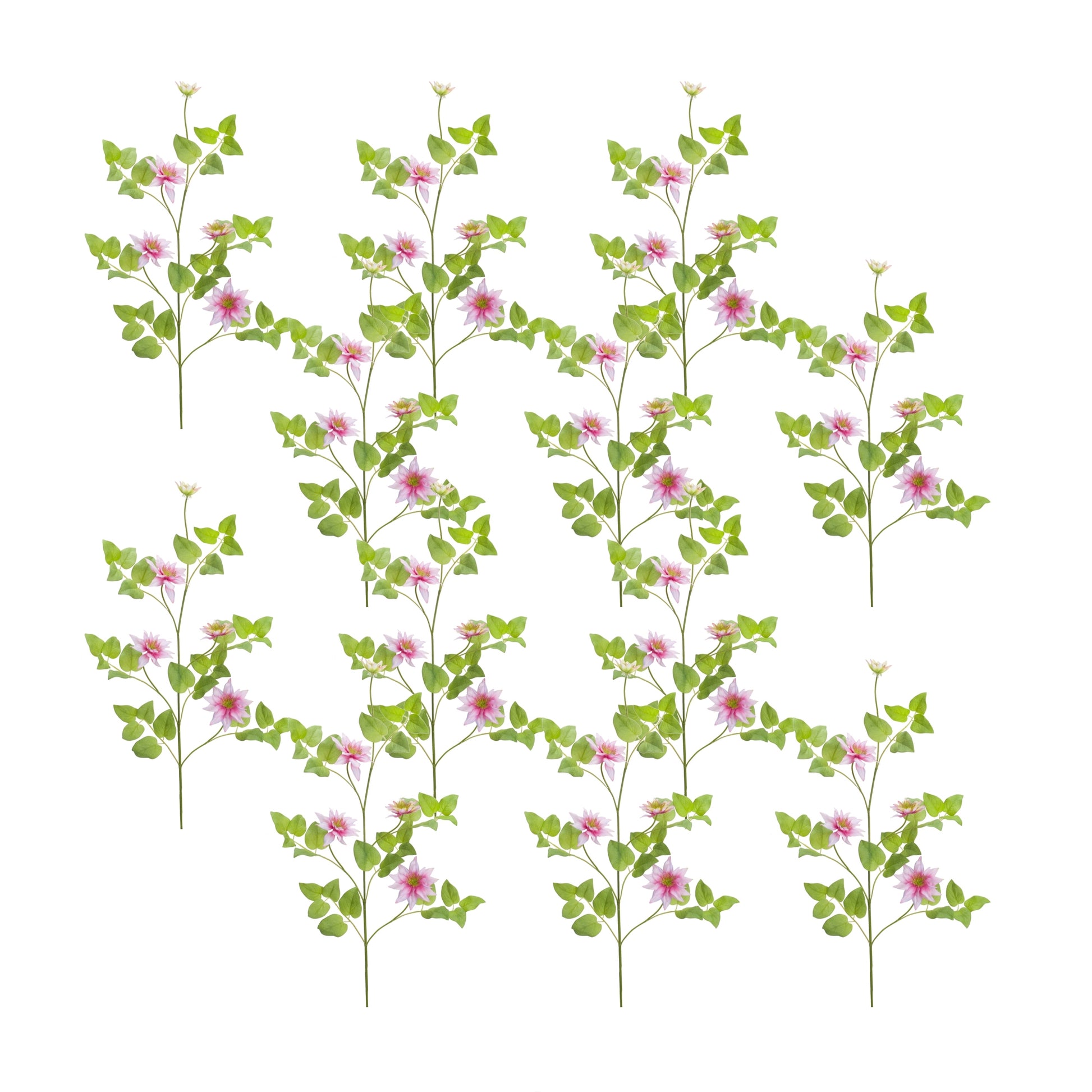 Welcome the spring season with this beautiful set of Clematis Vine Sprays. Featuring twelve pieces, this set would be a great addition to your spring floral vases or arrangements. The soft pink flowers paired with the bright green foliage is the perfect combination to create a stunning spring display. The quality polyester flowers are sure to last for seasons to come.