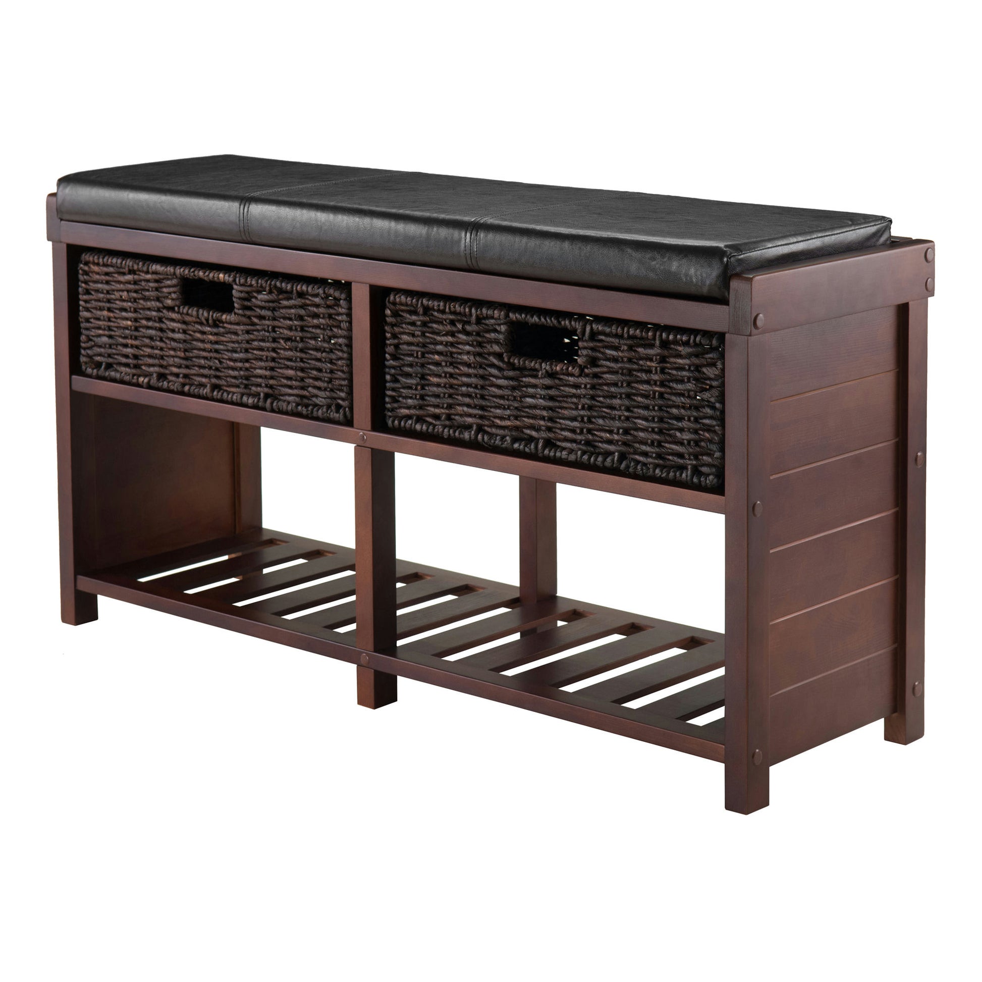 Colin Bench is a great choice for any home that needs extra seat with plenty of storage from your bedroom to entryway. This bench features dark faux leather cushioned seat, two foldable corn husk storage baskets and slated shelf for shoes.