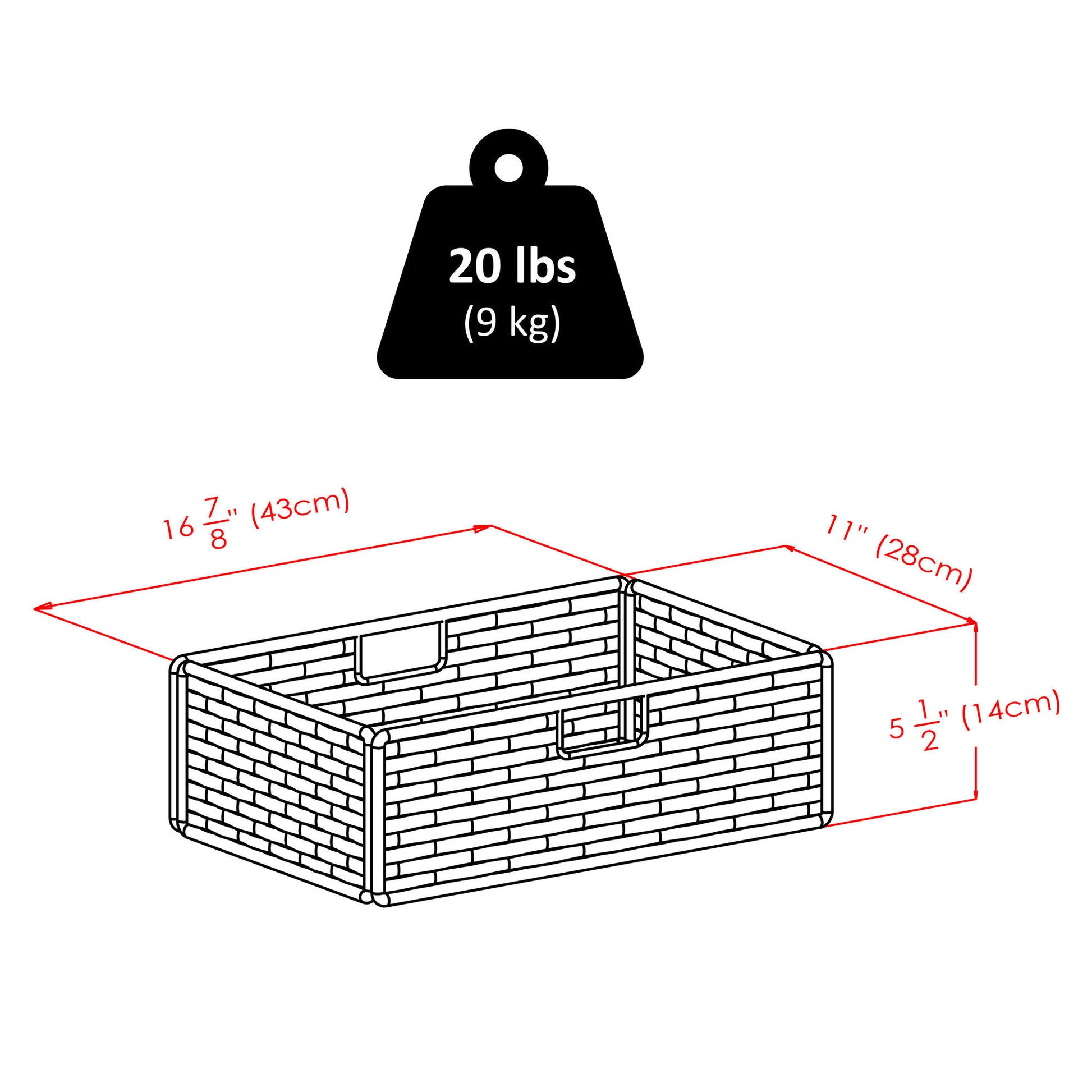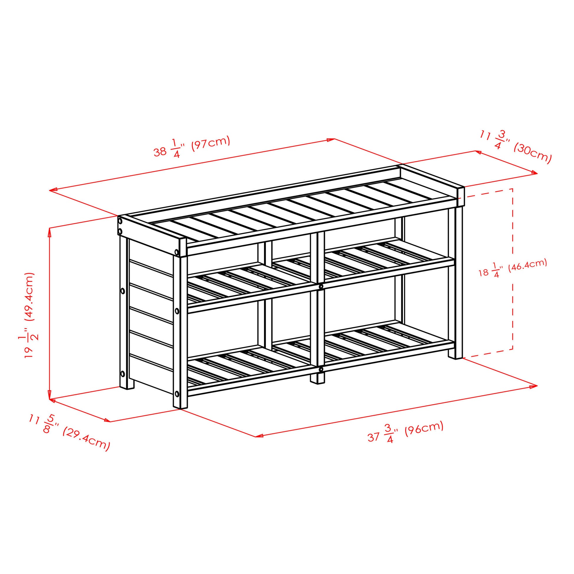 - Overall bench size is 38.1"W x 11.8"D x 20.2"H. Two baskets open to 16.9"W x 11"D x 5.5"H.