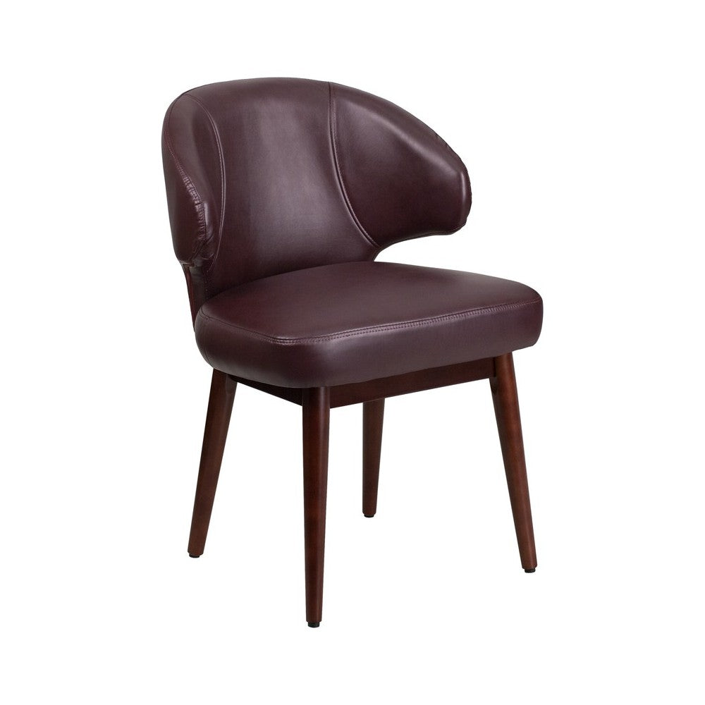 Add impeccable style to your reception waiting room or office with this burgundy LeatherSoft upholstered designer looking side chair. LeatherSoft is leather and polyurethane for added softness and durability. This chair features full back support with an enveloping back design. The curved back can double as a place to rest your arms. The rich walnut frame finish creates a striking contrast that gives a posh, upscale look to this piece. High wooden legs add an open appealing look that brightens up the space. Add this chair anywhere you want to create a cozy reading nook, offer extra seating or fill under-used corners. [BT-3-BG-GG]