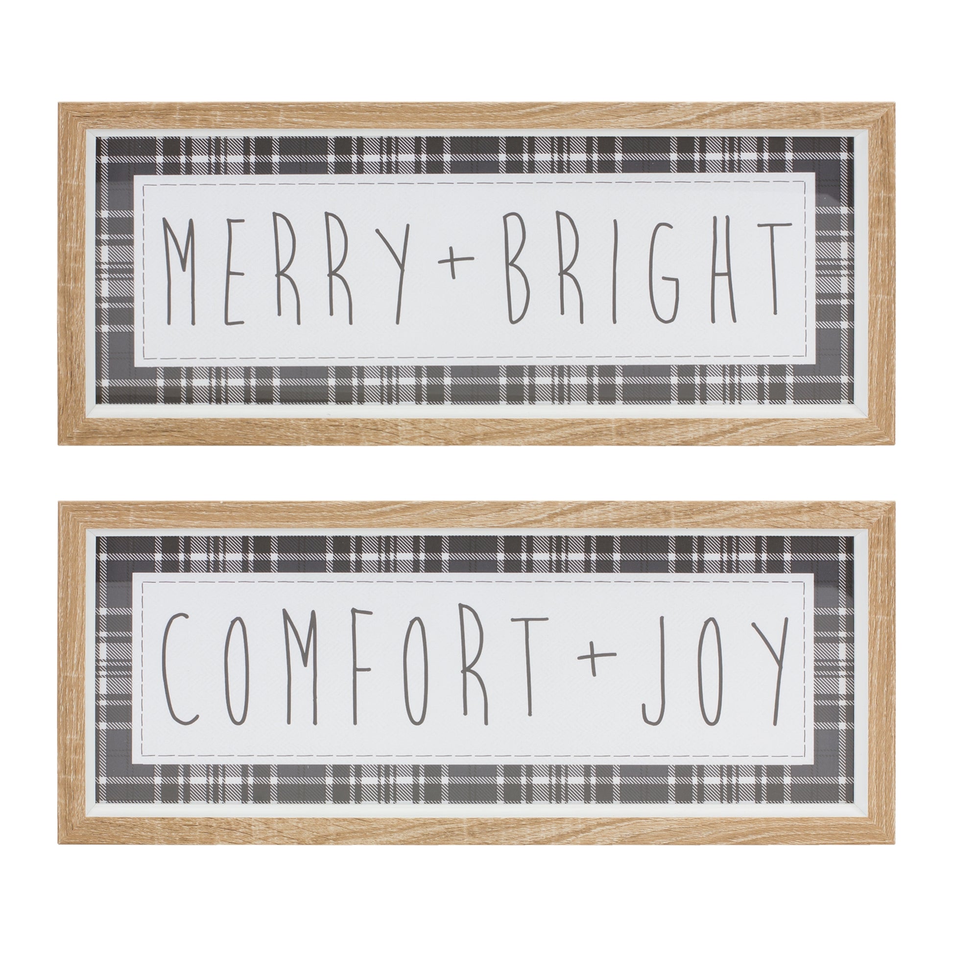 Welcome guests to your home in style with this beautiful set of Holiday Sentiment Signs. Featuring the sentiments "Merry + Bright" and "Comfort + Joy", the black and white plaid design paired with the faux natural wood frame is the perfect combination to create a stunning holiday display. The quality MDF and plastic composition is sure to last for seasons to come. Display this piece in your entryway or living room to share the sentiment with your guests.