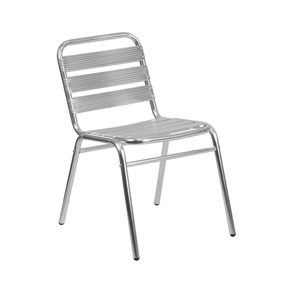 If you need a great looking, armless chair that will hold up in high traffic establishments then this Indoor-Outdoor Aluminum Restaurant Stack Chair is a great find. This popular piece will look great inside your eatery, on the sidewalk outside your bistro or on your patio by the pool. Constructed of lightweight aluminum, this chair is perfect for stacking for storage. Support braces under the seat add increased strength and stability. In fact, this sturdy chair will hold up to 352 pounds. Plastic floor glides protect your floor by sliding smoothly when you need to move the chair. Designed for both commercial and residential use, this stylish aluminum chair is a great seating choice. [TLH-015-GG]