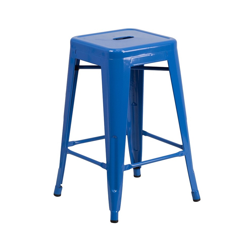 Upgrade the seating in your restaurant, eatery or home with this colorful counter stool with growing popularity. This space-saving stool is stackable making it great for storing. This stool features a backless, lightweight design that allows easy movement from inside areas to the patio or sidewalk to enjoy nice weather. A cross brace underneath the seat adds extra stability and features plastic caps that prevent the finish from scratching when stacked. The legs have protective floor glides that prevent damage to flooring. This all-weather use stool is great for indoor and outdoor settings. For longevity, care should be taken to protect from long periods of wet weather. The unique design of this backless stool gives it the versatility to be used in multiple spaces. [CH-31320-24-BL-GG]